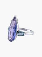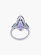 Bague en or blanc 18K ornée au centre d’une améthyste taille poire d’importante taille, épaulée par deux spinelles bleus de taille trapèze. Pièce unique. Poids : 5.8 grammes