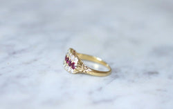 Bague bandeau en or jaune 18kt (poinçon : hibou), ornée en son centre d'une ligne de rubis ronds (dont le poids total est estimé à environ 0,85 Ct) dans un entourage de deux lignes de diamants taillés à l'ancienne.(dont le poids total est estimé à environ 0,70 Ct).Travail Victorien du XIXe siècle.Poids brut: 4,48gHauteur du motif: 0.90 cmTour de doigt: 57 (diamètre 18.25 / US 8.00).État: très légères micro rayures sur les parties or, abrasion et inclusions naturelles dans les pierres, légère usure du serti, voir photos.