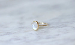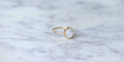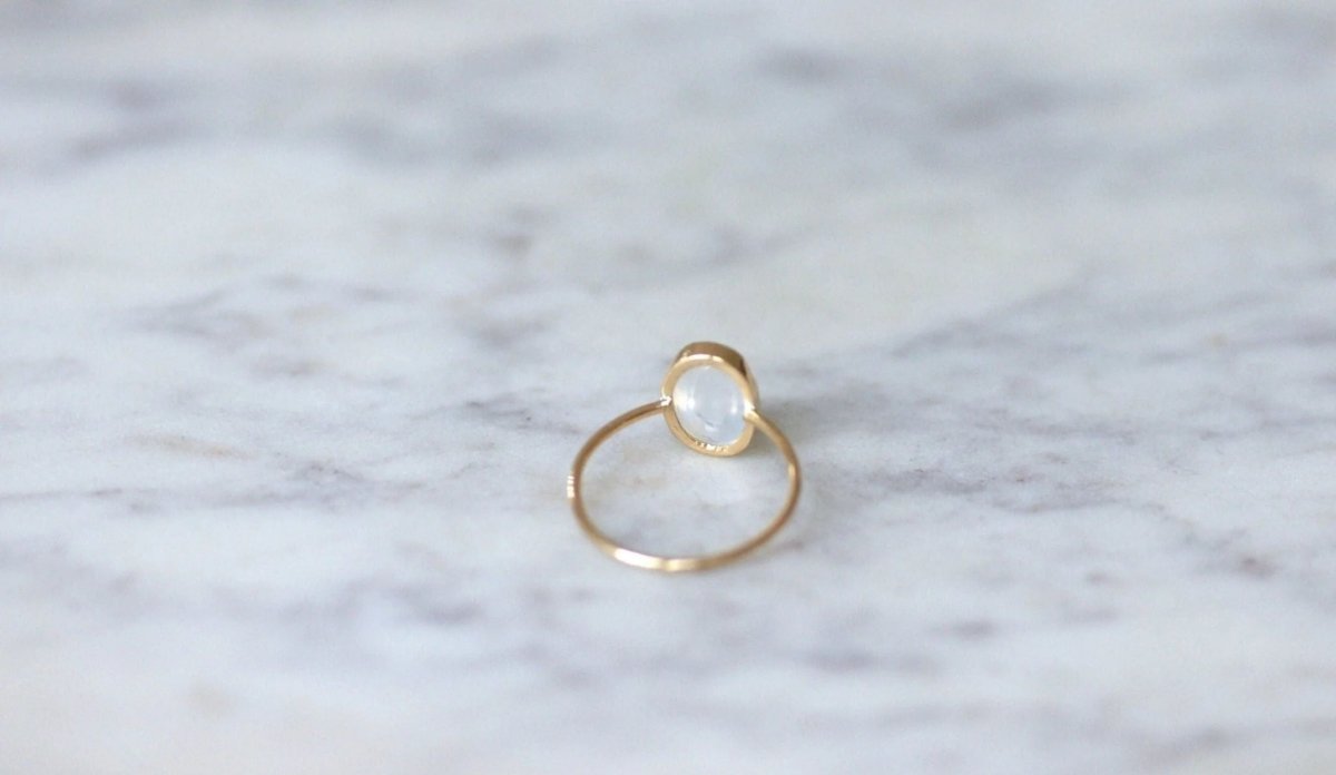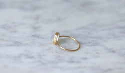 Bague ancienne en or jaune 18Kt, ornée d'un cabochon de pierre de lune. Epingle ancienne du XIXe siècle transformée par notre joaillier Parisien en bague. Poids brut: 1,58g Hauteur du motif: 1.00 cm Largeur du motif: 0.80 cm Tour de doigt: 52 (diamètre 16,50 / US 6,00). État: très légères micro rayures, voir photos. Saviez-vous que dans de nombreuses culture, la lune symbolise la lumière féminine? Cette bague ancienne à la douce teinte opalescente illuminera votre doigt 🌙. Toutes nos bagues anciennes.