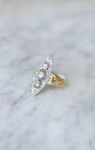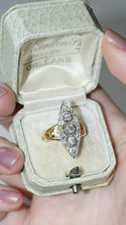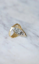 Bague Marquise en or jaune 18kt et platine (poinçons : hibou et mascaron), ornée de trois diamants taillés à l'ancienne, dont le poids total est estimé pour environ 0,50 Ct, dans un entourage de diamants taille rose et taille ancienne, dont le poids total est estimé pour environ 0,40 Ct.Couleur des diamants allant de H à I, pureté de SI à P. Anneau ajouré de motifs végétaux et de trèfles. Travail de la fin du XIXe / début du XXe siècle, Belle Epoque.Numérotation à l'intérieur de l'anneau. Poids brut: 5,12gHauteur du motif: 2,60 cmLargeur du motif: 1,00 cm Tour de doigt: 55 (diamètre 17,40 / US 7,00). État: très légère déformation et très légères micro rayures sur les parties or et platine, légère usure du serti, inclusions naturelles dans les pierres, égrisures et chocs sur quelques diamants, voir photos. Le diamant, comme l'or, supportent les hautes températures. Pour nettoyer votre bijou, il sera donc possible de la plonger dans l'eau très chaude avec un peu de savon, puis de la frotter délicatement avec une brosse à dents. Retrouvez d'autres conseils pour l'entretien de vos bijoux dans notre journal ! Toutes nos bagues anciennes.