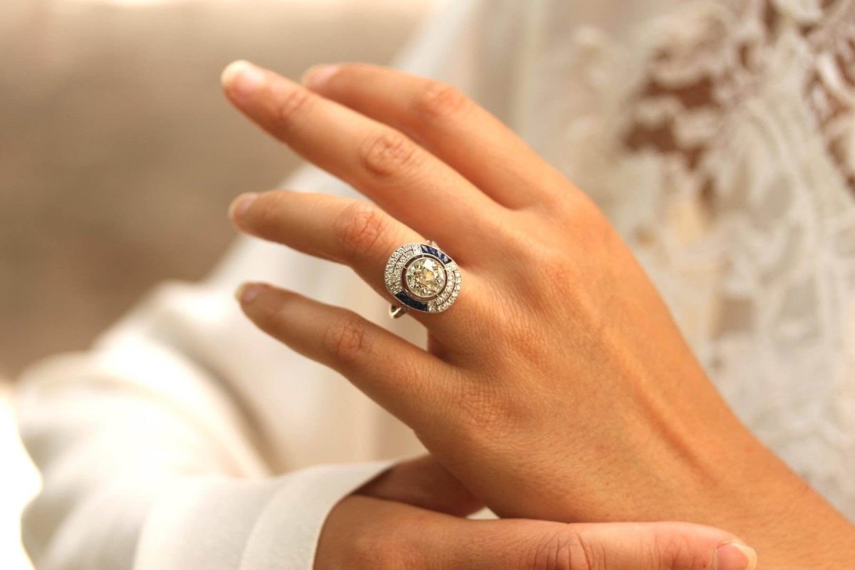 Pierres : Diamant de taille ancienne L/M-Si, pavage de diamants et saphirs calibrés. Matière : Platine