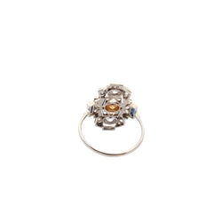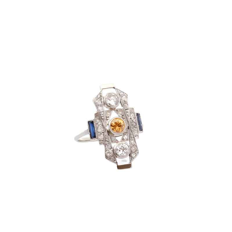 Bague Art Déco en or blanc 18 carats, sertie de 2 saphirs, de 3 diamants au centre et de 22 diamants.
