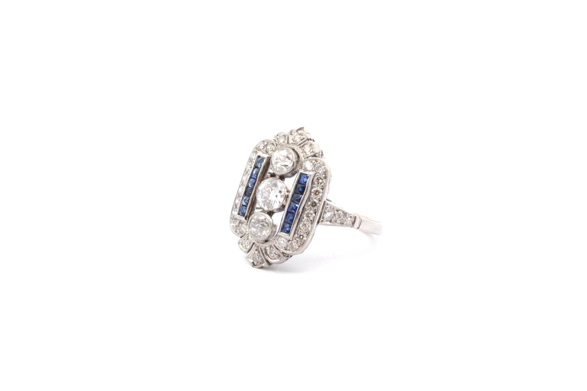 Bague en platine, sertie de 3 diamants au centre, de 26 diamants et de 12 saphirs