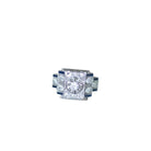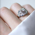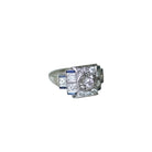 Bague de fiançailles Art Déco en or blanc 18Kt et platine (poinçons: tête d'aigle et chien) sertie en son centre d'un diamant taillés à l'ancienne pesant environ 0,15 Ct (Couleur estimée H, et pureté estimée SI2), dans un entourage de diamants taillés à l'ancienne et en demi taille (poids total estimé pour environ 0,60 Ct), et de saphirs synthétiques taillés en baguette. Travail Français, circa 1935, Art Deco. Poids brut: 4,23 g Hauteur du motif: 1,20 cm Largeur du motif: 1,80 cm Tour de doigt: 56 (diamètre 17.75/ US 7,50). État: très légères micro rayures sur les parties or et platine, légère usure du serti, et légère abrasion sur les pierres, voir photos.