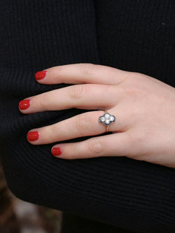 Bague ancienne or jaune diamants saphirs calibrés Bague Art-Déco en or 18k (750°/°°) quadrilobée sertie de quatre diamants taille ancienne (old european cut) pesant au total environ 1 ct (H SI, inclusions invisibles à l'oeil nu) dans un entourage de saphirs calibrés. Travail probablement français des années 1920. Tour de doigt 52, mise à taille possiblePoids brut : 2,77 grammes