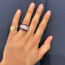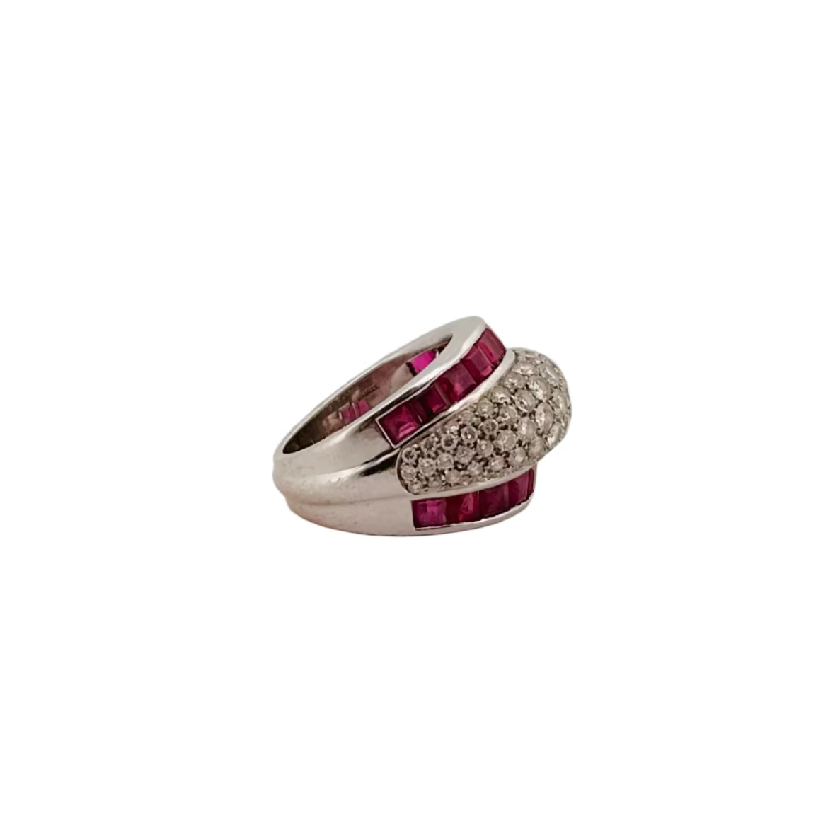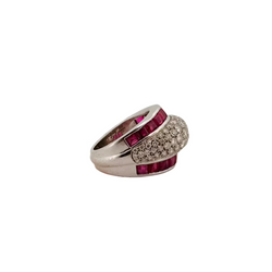 Bague Bandeau en or blanc 18 carats ornée d’un pavage de diamants taille brillant totalisant environ un carat dans un entourage de rubis baguette.Travail Italien.