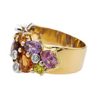 Bague bandeau or jaune 750 millièmes (18 carats). sertie d'un grenat rouge taille coussin d'environ 2.03 cts. de 10 saphirs de couleurs dont 5 de taille ovale environ 0.65 ct chacun. 4 de taille ronde d'environ 0.25 ct. et un de taille poire environ 0.84 ct. de 6 diamants taille brillant. d'environ 0.02 ct chacun. Poids total estimé des saphirs de couleurs: 5.09 cts. poids total diamants: environ 0.45 ct. largeur sur le dessus: 1.38 cm. tour de doigt: 59. poids total: 11.01 g. poinçon tête d'aigle. excellent état