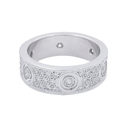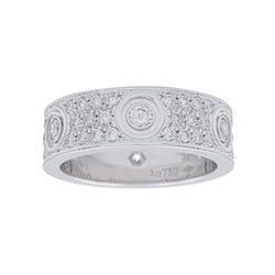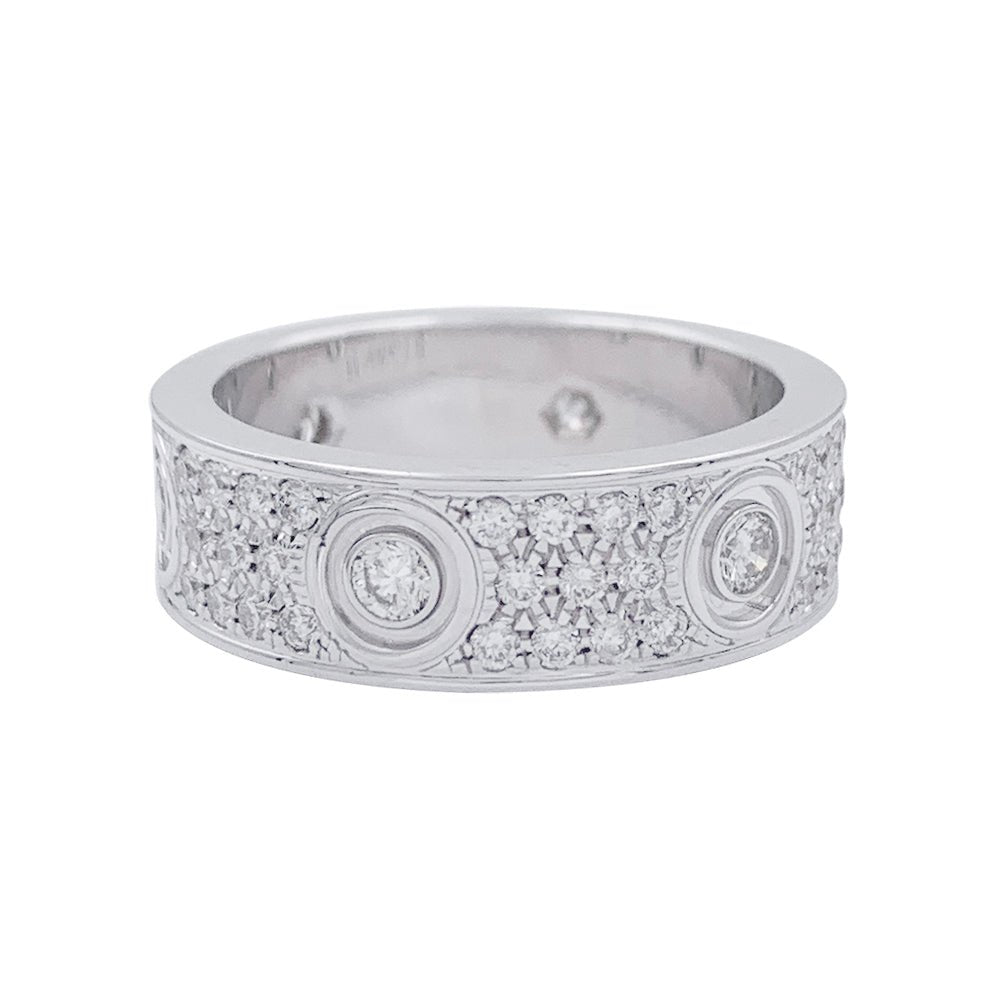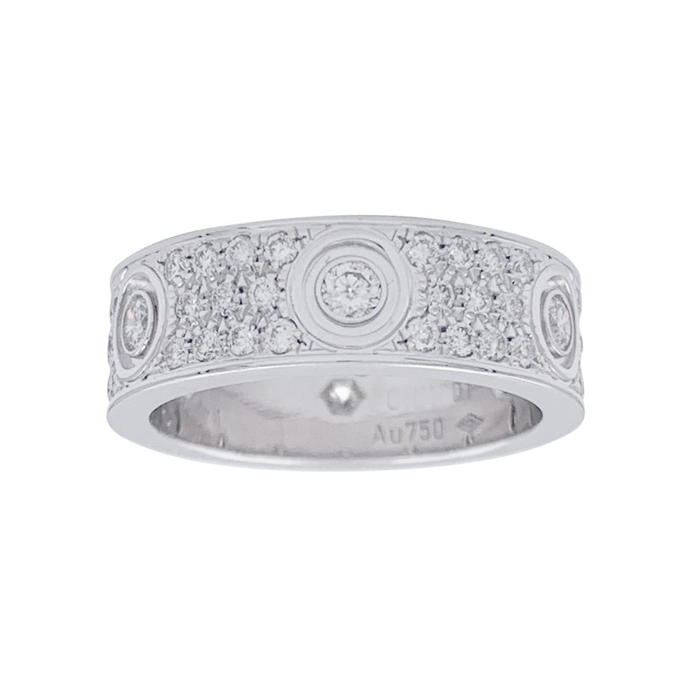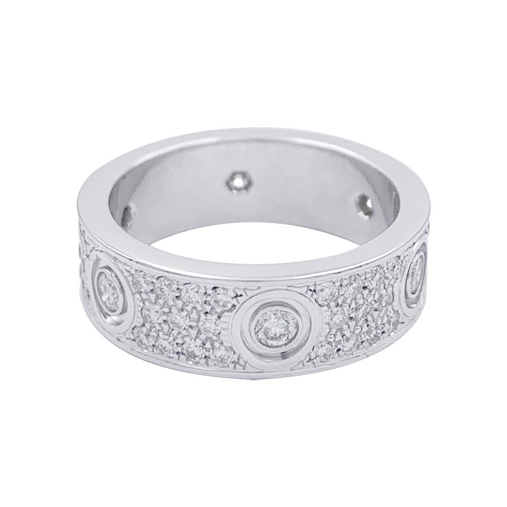 Une bague signée de la maison Cartier en or blanc 750/000, collection 'Love', sertie de 72 diamants taille brillant. Largeur : 6,5 mm Poids : 9,4 grammes Poids du diamant : 1,26 ct au total Prix neuf : 17600 Tour de doigt : 55