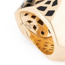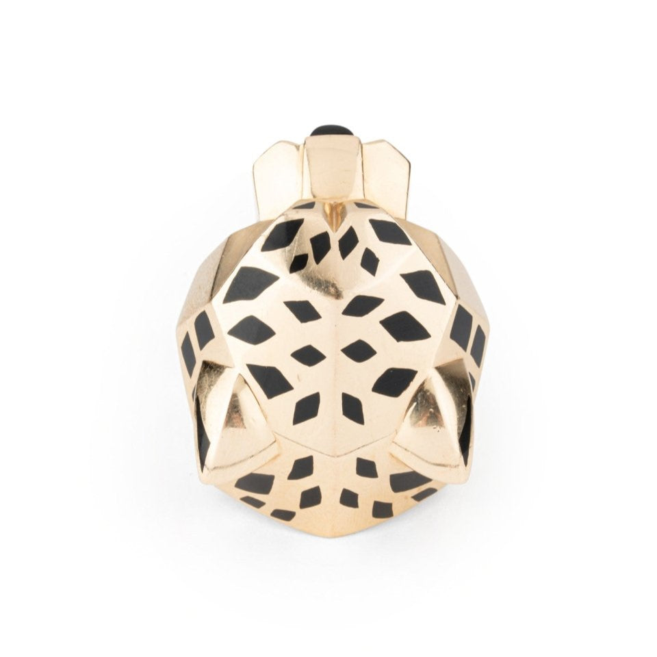 Bague CARTIER "Tête de panthère" en or jaune 18 carats, laque noire, onyx et deux péridots formant les yeux. Prix de vente neuf (2024) : 32 400 €.