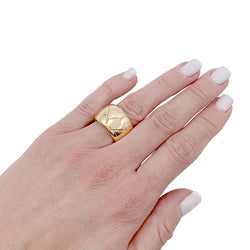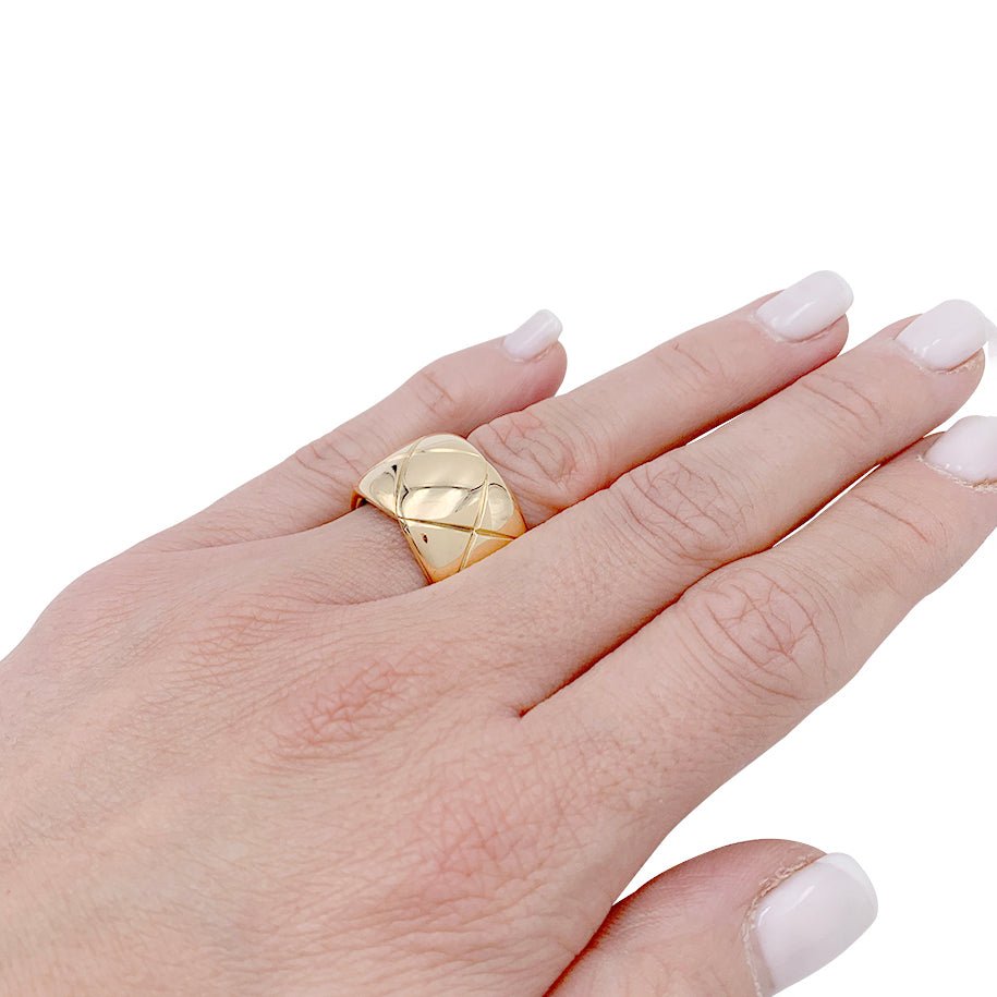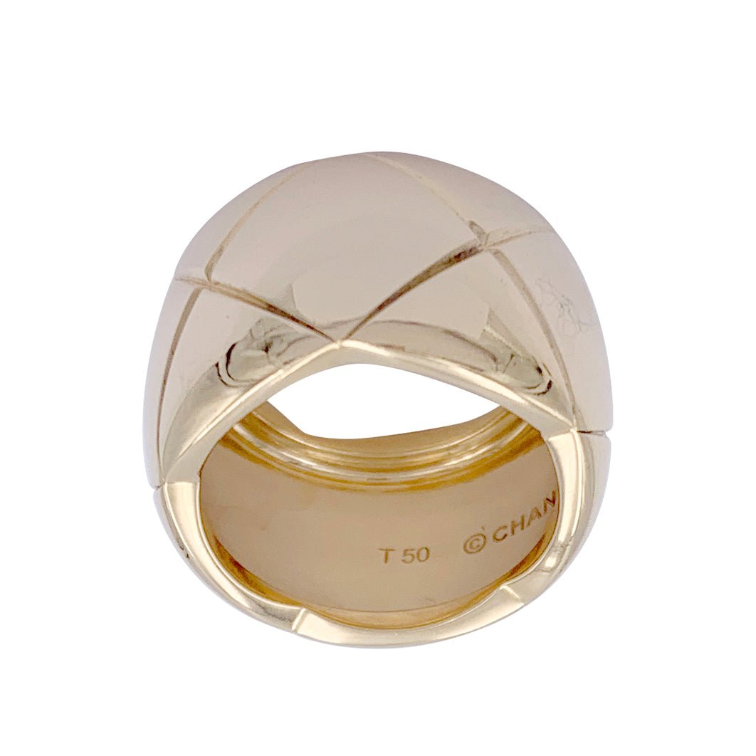 Une bague signée de la Maison Chanel, modèle 'Coco Crush', en or jaune 750/000 figurant un large bandeau matelassé. Très grand modèle. Largeur : 14 mm Poids : 13,3 grammes Tour de doigt : 50