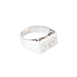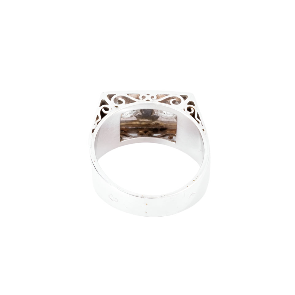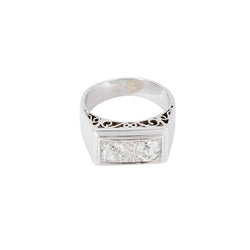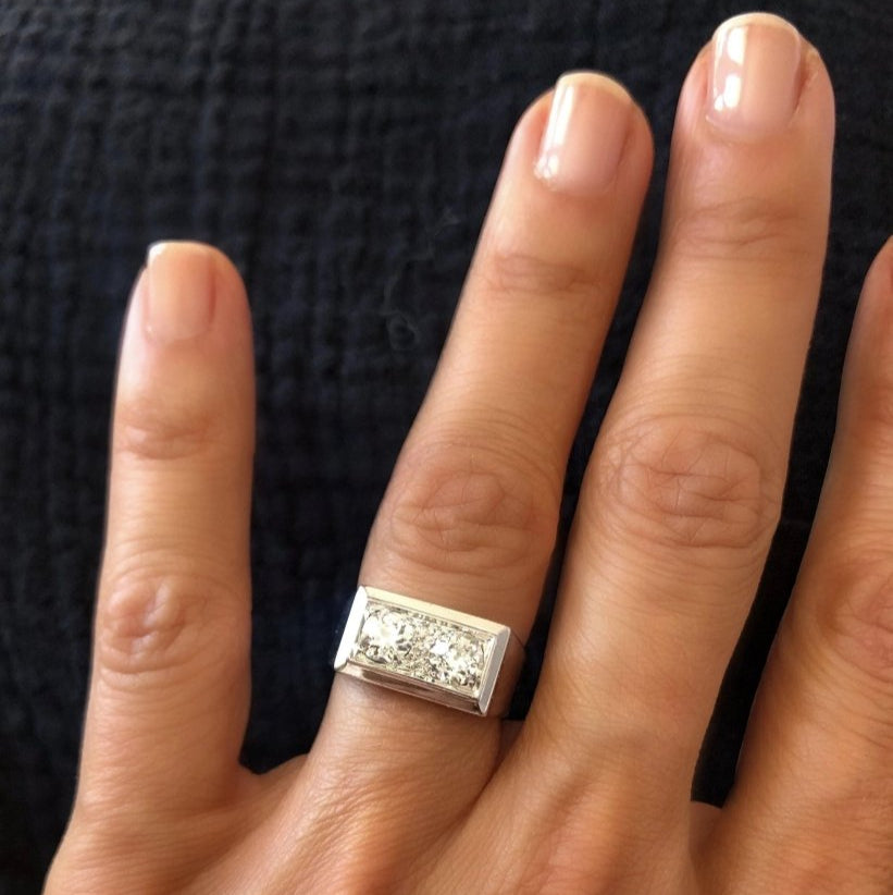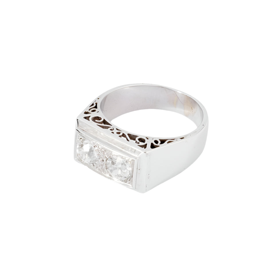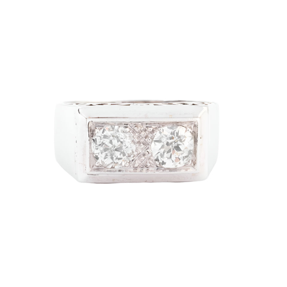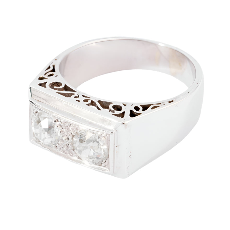 Bague Chevalière en or blanc 18 carats et platine, ornée en serti-clos de 2 diamants taille ancienne. Circa 1930.