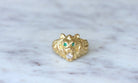 Bague tête de lion en or jaune 18kt (poinçon tête d'aigle), aux yeux sertis de deux pierres vertes (calcédoines vertes), et tenant dans sa gueule un diamant taille brillant pesant environ 0,25Ct (couleur estimée H, pureté estimée SI). Bien qu'elle soit prise en photo sur le doigt d'une femme, cette bague sera également parfaite sur un homme. Travail Français vintage. Poids brut: 12,25 g Hauteur: 1,70 cm Tour de doigt: 57 (diamètre 18,00 / US 7,80). État: très légères micro rayures sur les parties or, voir photos.
