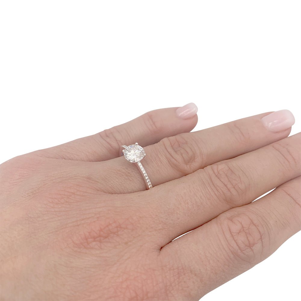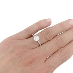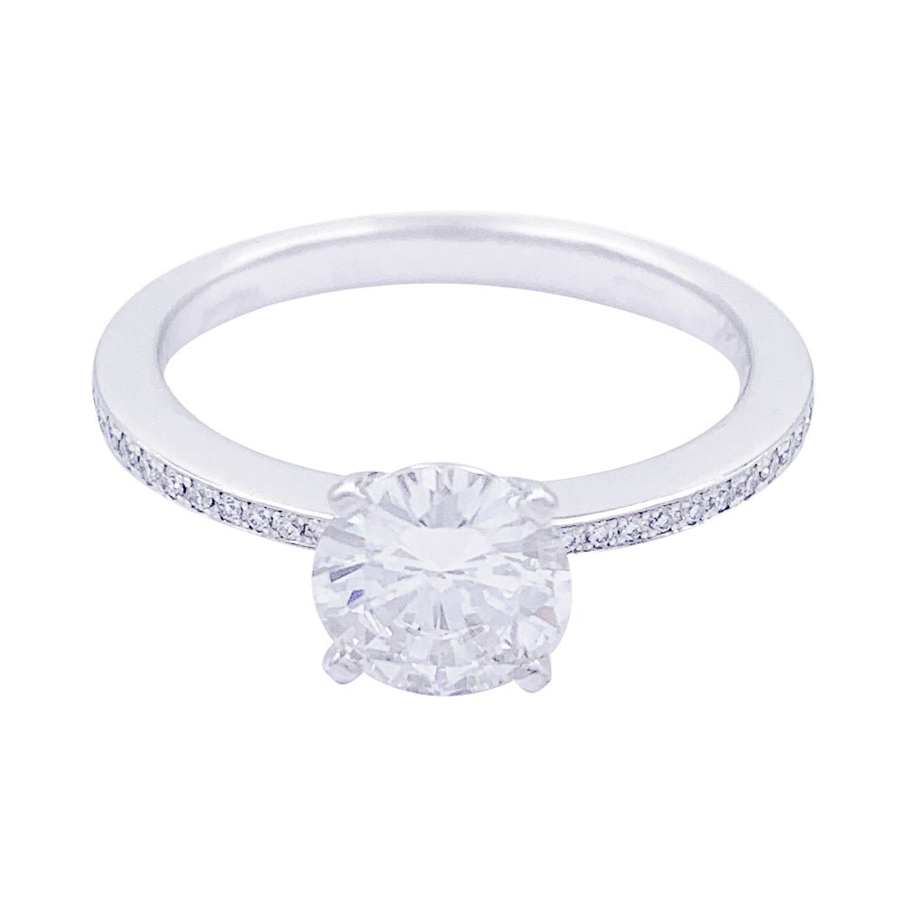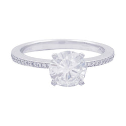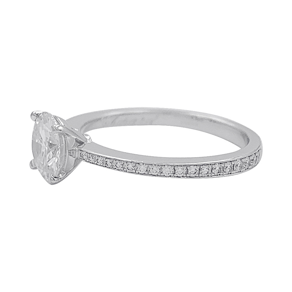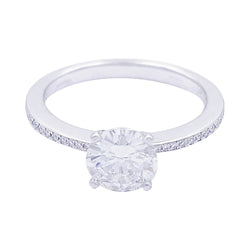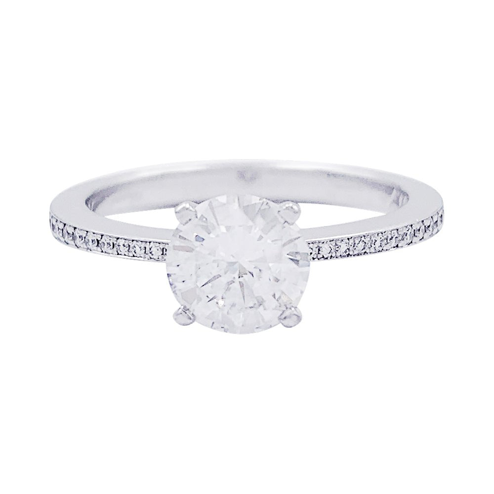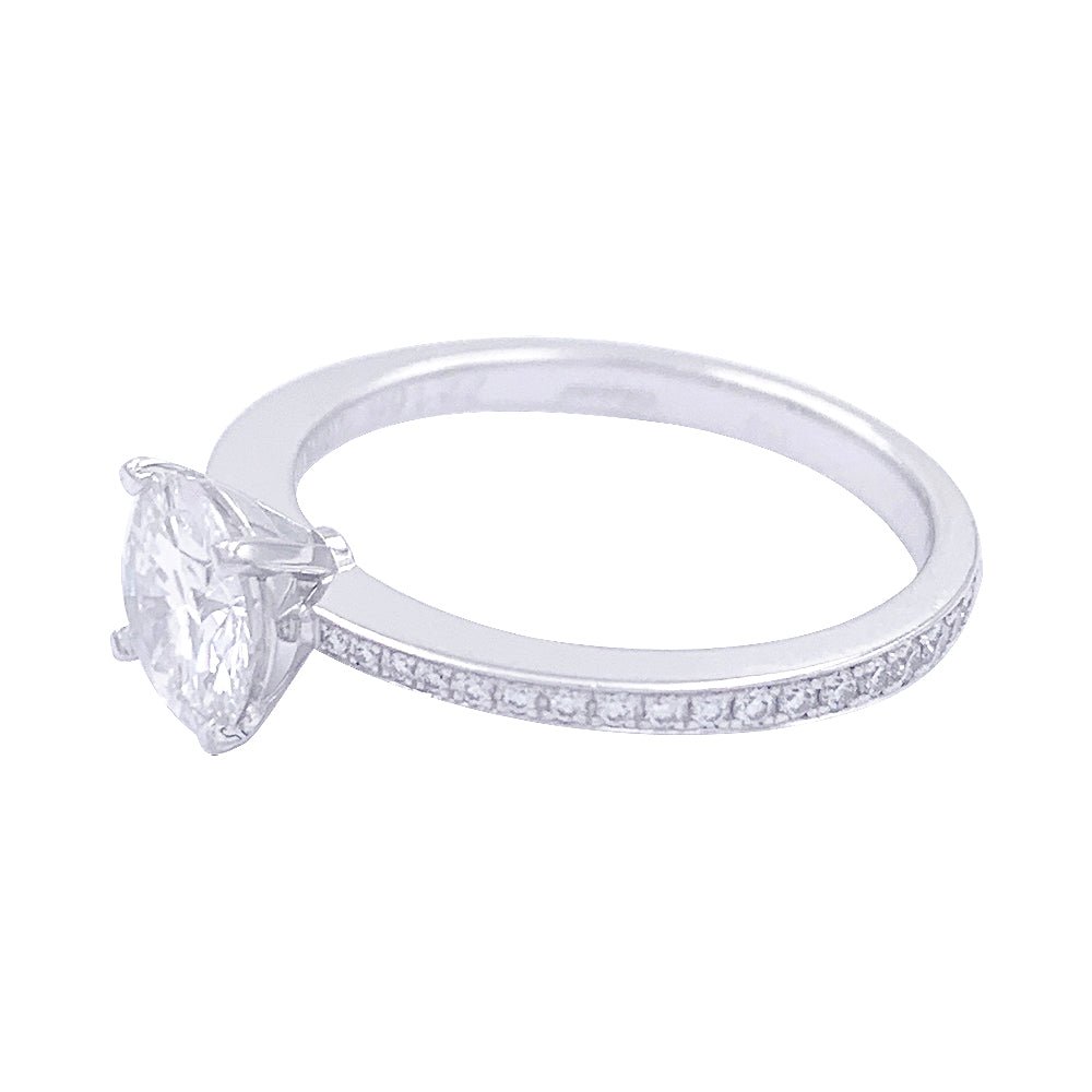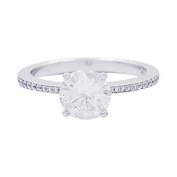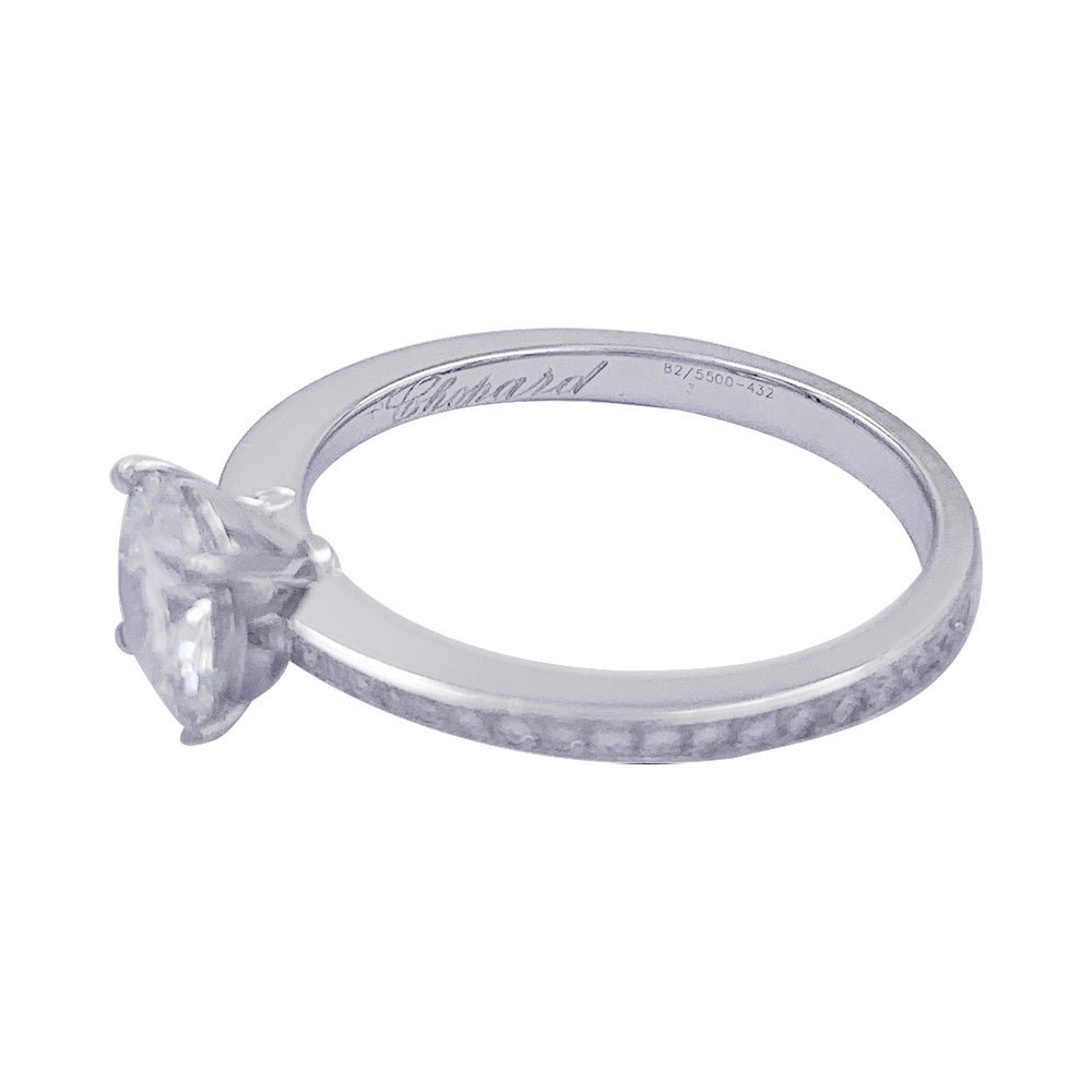 Un solitaire accompagné signé de la Maison Chopard en or blanc 750/000 serti d’un diamant de 1,01 ct, qualité F/VS1, épaulé de 36 diamants (0,22 ct au total). Rapport du GIA. Poids : 3,2 grammes Poids du diamant : 1,01 ct Tour de doigt : 54