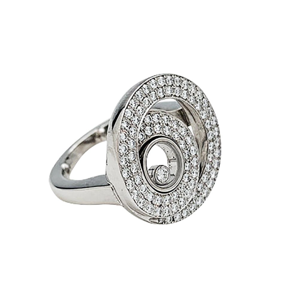 Une bague signée de la Maison Chopard, modèle “Happy Diamonds”, en or blanc 750/000, figurant deux cercles entrelacés pavés de diamants taille brillant protégeant un diamant mobile entre deux disques de verre. Diamètre : 20 mm Poids : 15,9 grammes. Poids du diamant : 0,77 carat Tour de doigt : 52