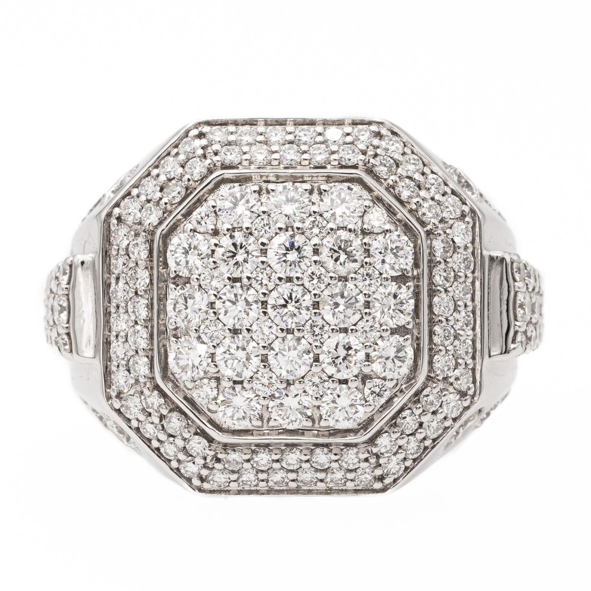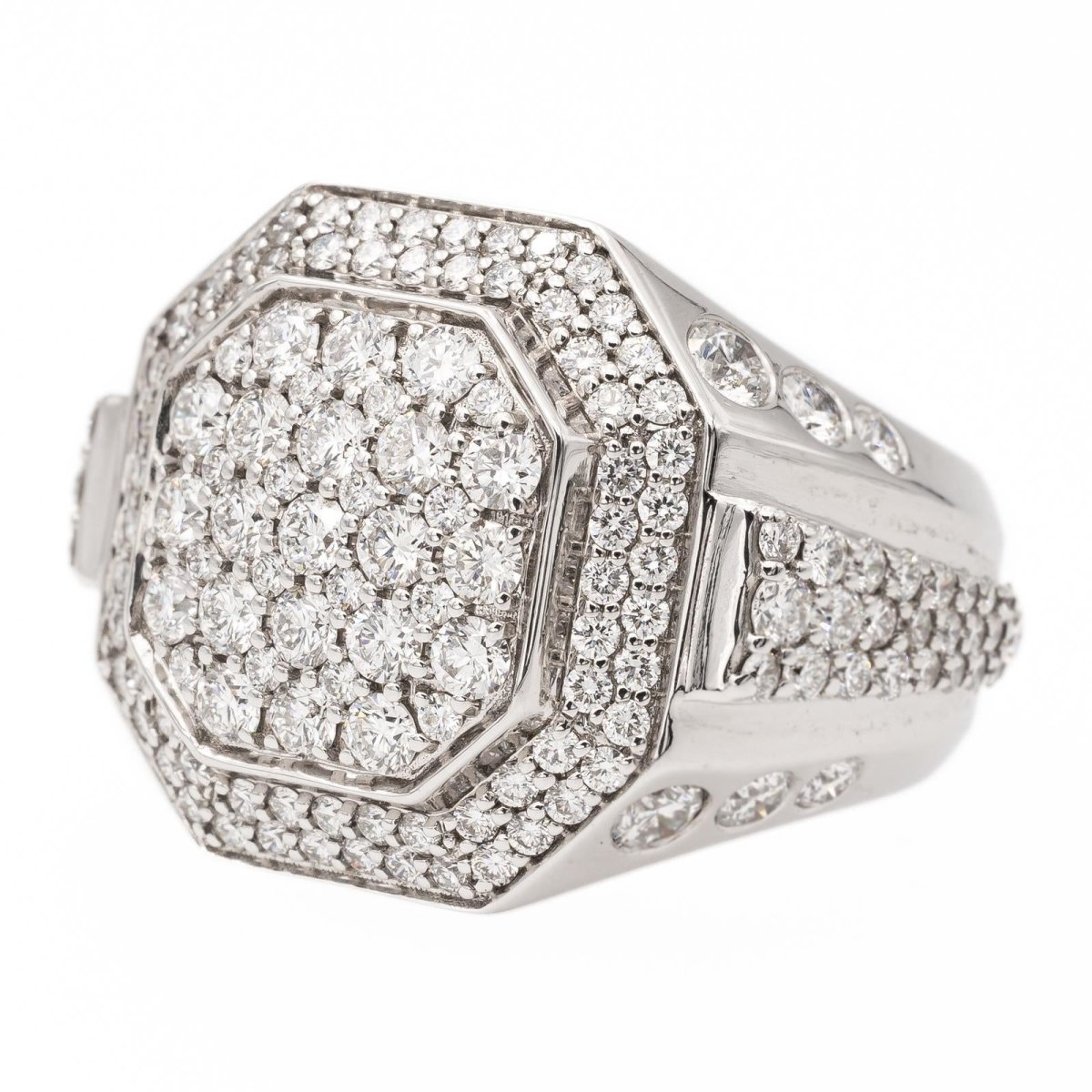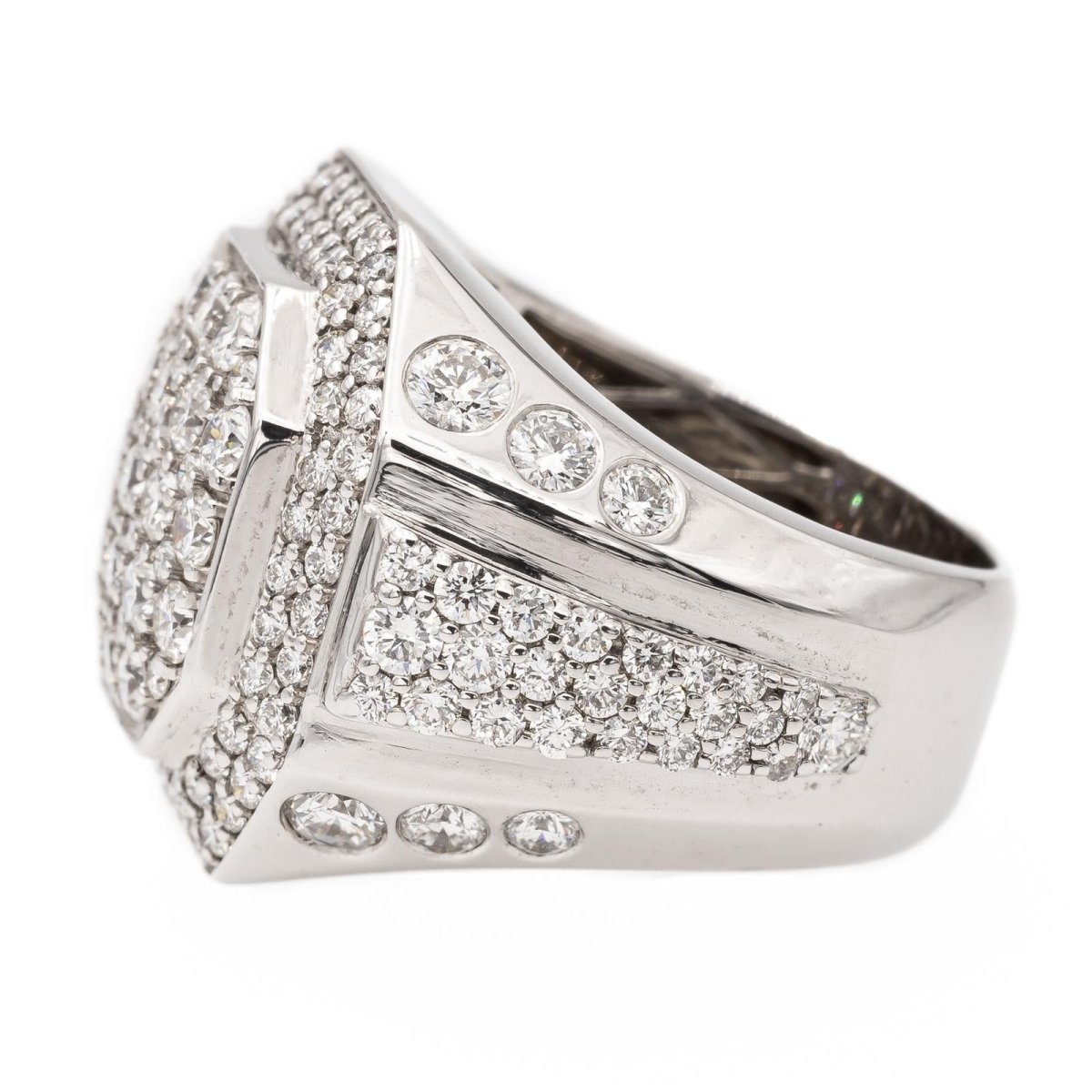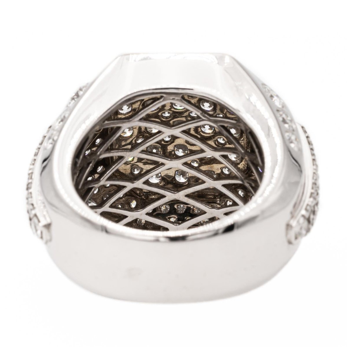 Bague cocktail en or blanc 750 millièmes (18 carats). sertie d'un pavage de diamants taille brillant. poids total diamants: environ 2.20 cts. largeur sur le dessus: 1.9 cm. tour de doigt: 51. poids total: 14.29 g. poinçon hibou. excellent état