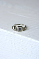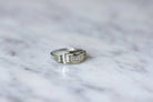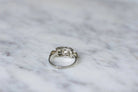 Bague Art Déco de fiançailles en or blanc 18kt et platine (poinçon tête d'aigle et chien) sertie en son centre d'un diamant taille ancienne, pesant environ 0,05 Ct. Circa 1935, Art Deco, France. Poids brut: 2,20g Tour de doigt: 54 (diamètre 17.20/ US 6,75). Hauteur du motif: 0.80cm État: légères micro rayures et oxydation sur les parties or et platine, voir photos. Le mouvement Art déco, abréviation de “Arts décoratifs”, naît vers 1910. Il connaît son apogée dans les années 20 pour ensuite décliner dans les années 30. En réaction aux formes arrondies et organiques de l’Art nouveau, ce style “Années folles” développe des formes géométriques et épurées. On reconnaît ce mouvement artistique sur cette bague de fiançailles grâce aux formes géométriques qui l'habillent. Toutes nos bagues anciennes