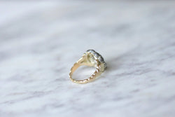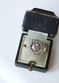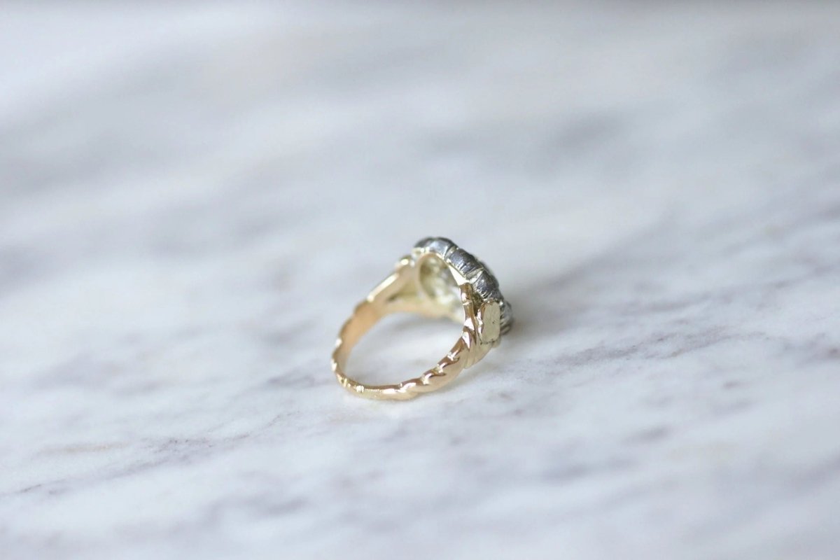 Bague marguerite de fiançailles ancienne en or jaune 18kt et argent (poinçon : hibou et cygne). Monture délicatement ciselée, ornée en son centre d'un diamant taillé à l'ancienne, pesant environ 0,85 Ct (Couleur estimée K, pureté estimée P) dans un entourage de diamants taillés en rose (pesant au total environ 0,20 Ct). Travail du XIXe siècle. Poids brut: 4,90gTour de doigt: 52 (diamètre 16,50 / US 6,00).Hauteur du motif: 1.40 cm