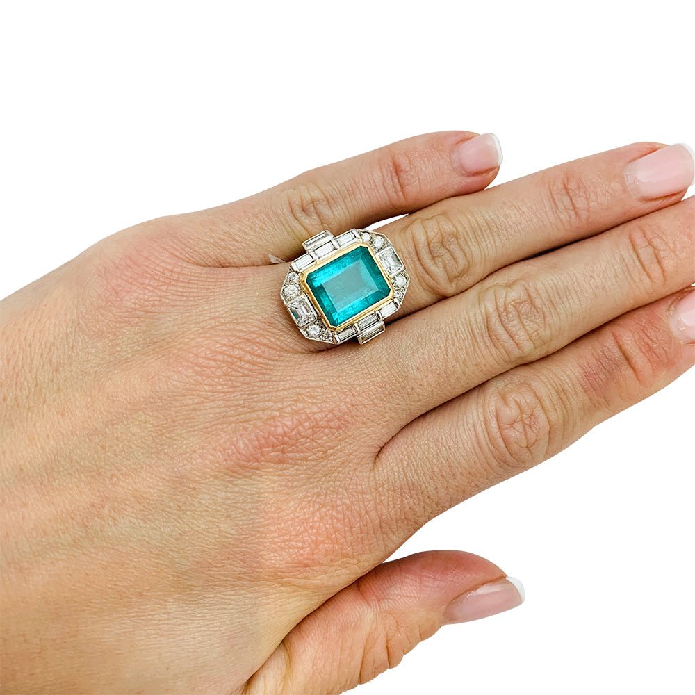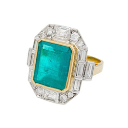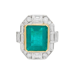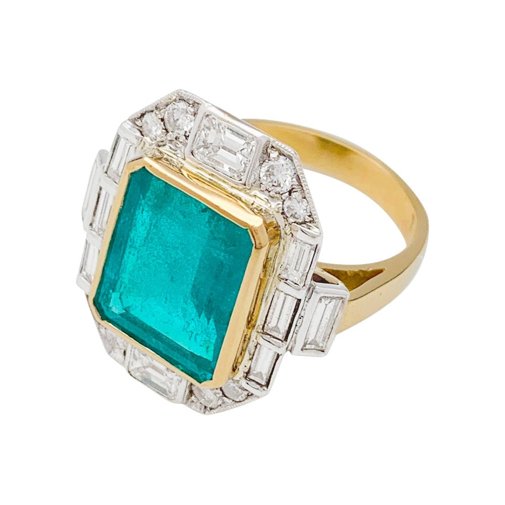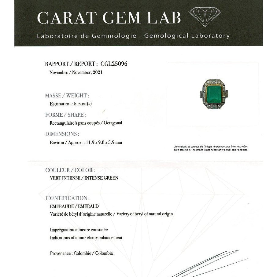 Une bague deux tons d’or 750/000 centrée d’une importante émeraude colombienne rectangulaire d'environ 5 carats entourée de diamants ronds et baguettes. Certificat Carat Gem Lab. Longueur : 21 mm Largeur : 19 mm Poids : 7,8 grammes Tour de doigt : 55