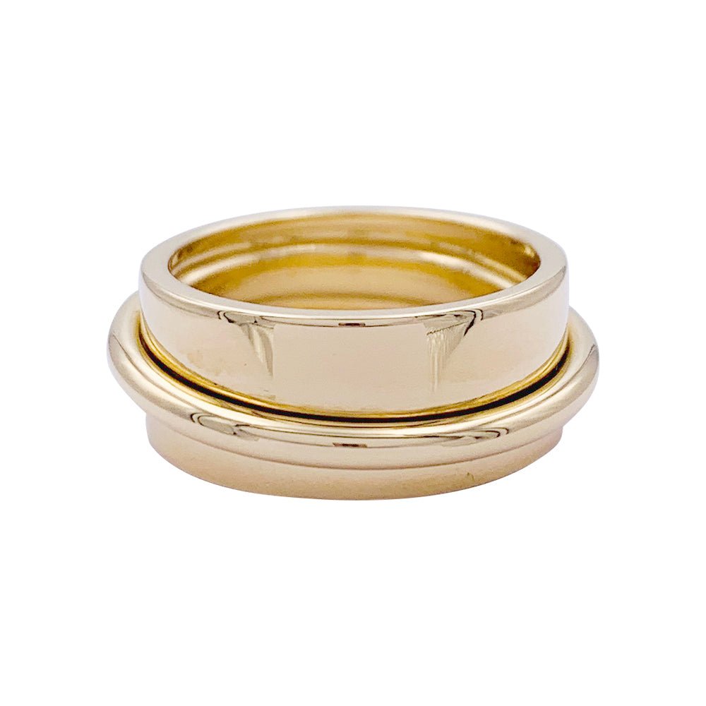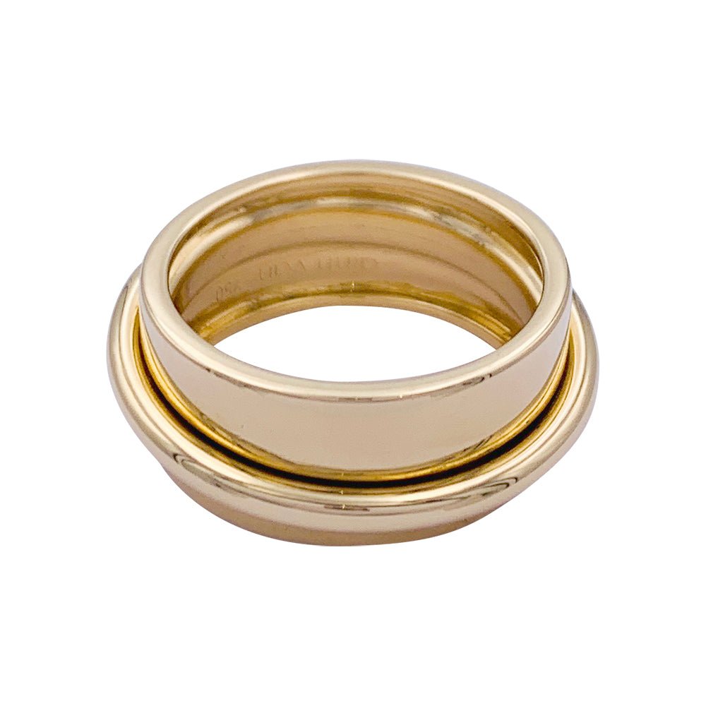 Une bague bandeau signée de la Maison Dinh Van en or jaune 750/000, collection 'Ariane', sur laquelle un anneau transversal coulisse librement. Largeur : 8 mm Poids : 8,3 grammes Tour de doigt : 50