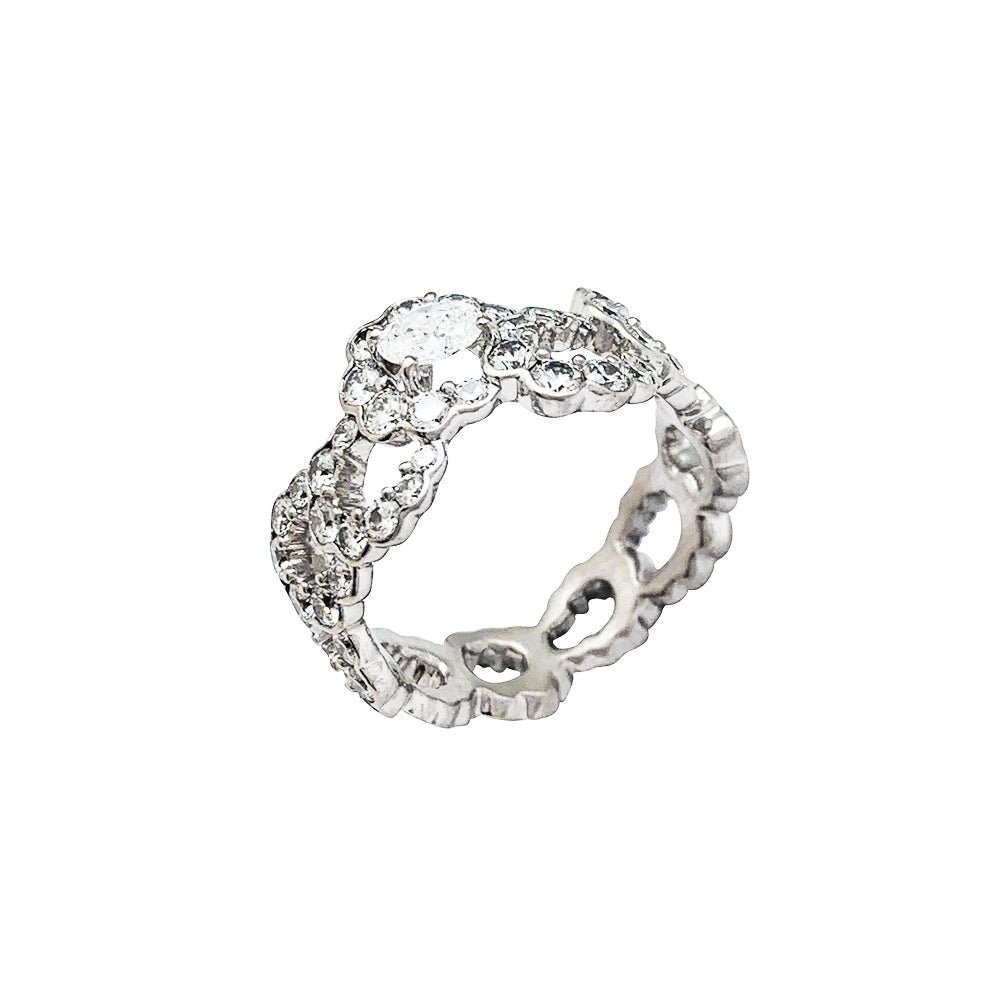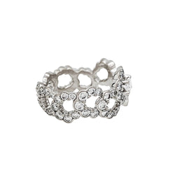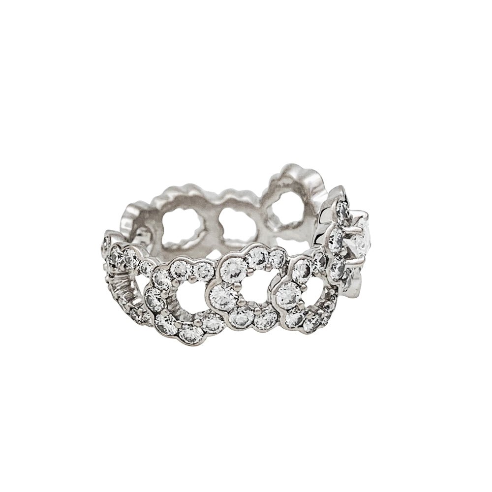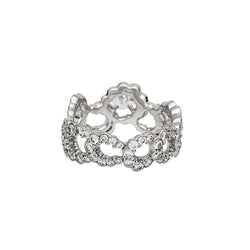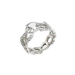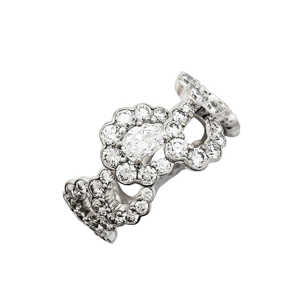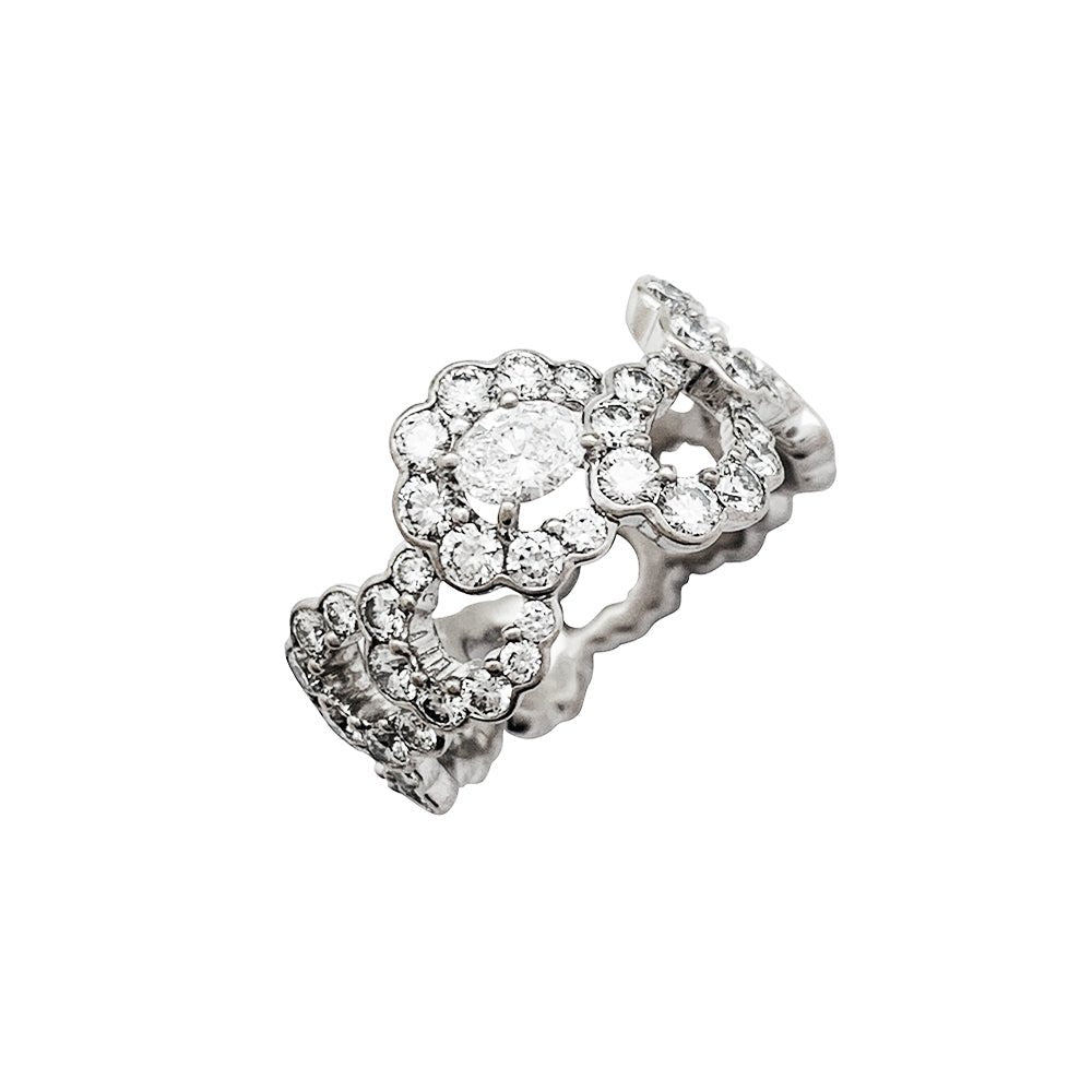 Une bague ruban signée de la Maison Dior, modèle “Archi”, en or blanc 750/000, entièrement sertie de diamants, centrée d'un diamant ovale plus important. Design inspiré de la robe “Junon” dessinée par Christian Dior pour le défilé “Milieu du siècle” de 1949. Largeur : 10 mm Poids : 4,8 grammes. Poids du diamant : environ 2,14 carats. Prix neuf : 19000 Tour de doigt : 51