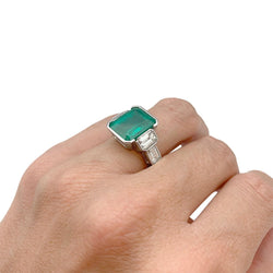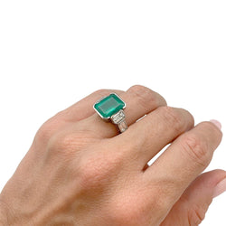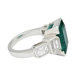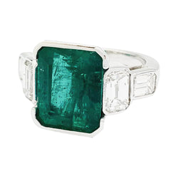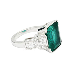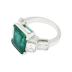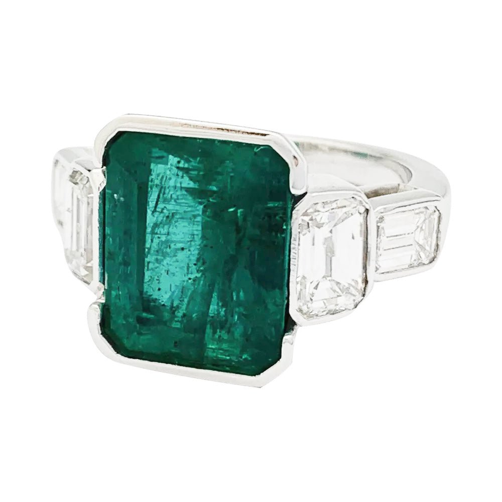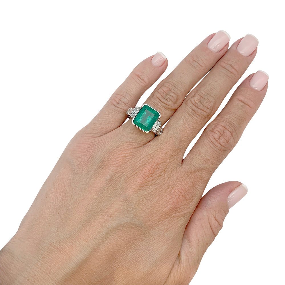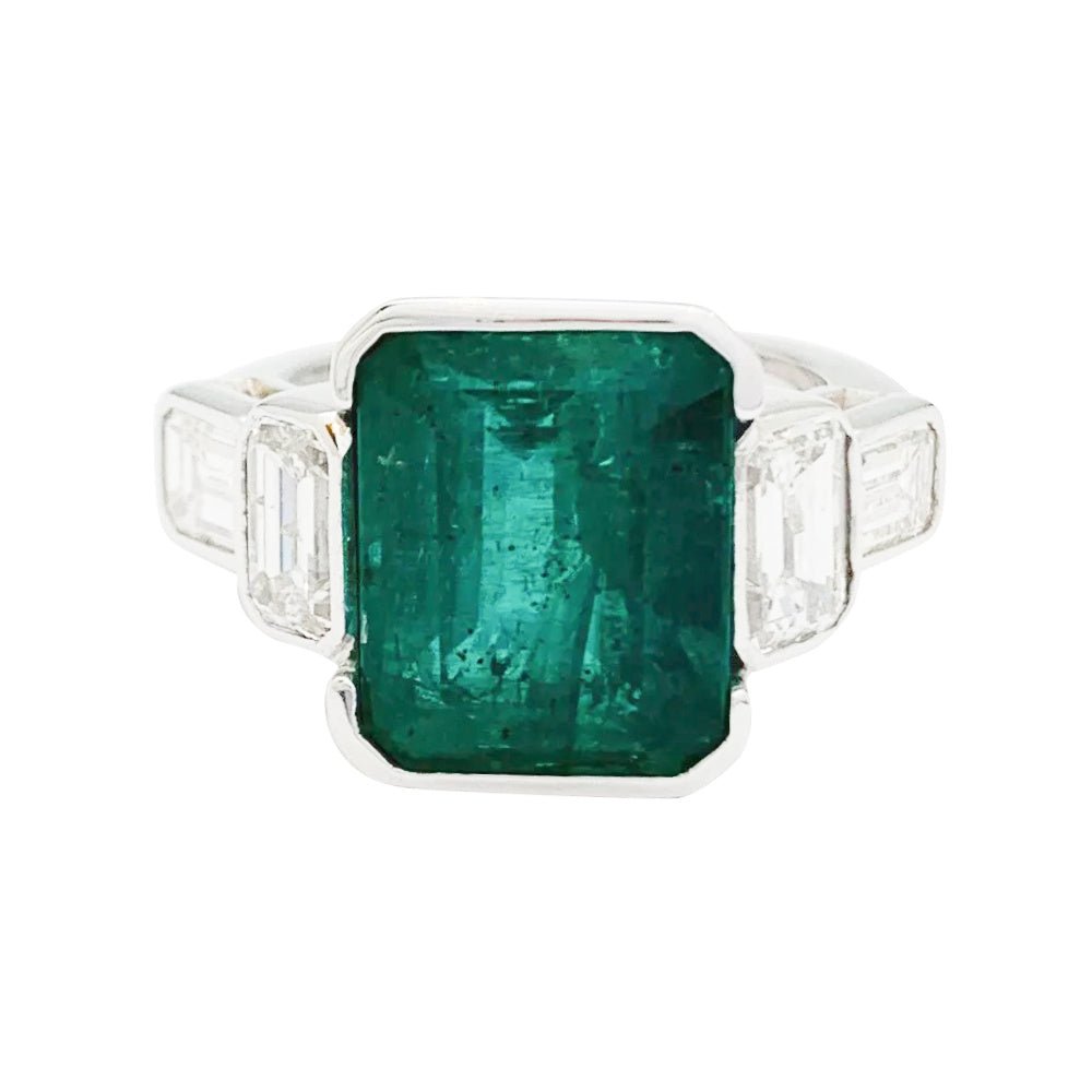 Une bague en or blanc 750/000 sertie d’une émeraude rectangulaire à pans coupés d'environ 6,43 cts épaulée de diamants taille émeraude. Poids : 8,7 grammes Poids du diamant : environ 1,40 ct au total Tour de doigt : 50