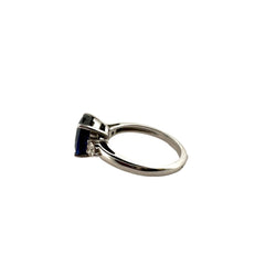 Bague en or gris 18 carats sertie d'un saphir ovale facetté épaulé de deux diamants. Poids du saphir : environ. 3,5 carats