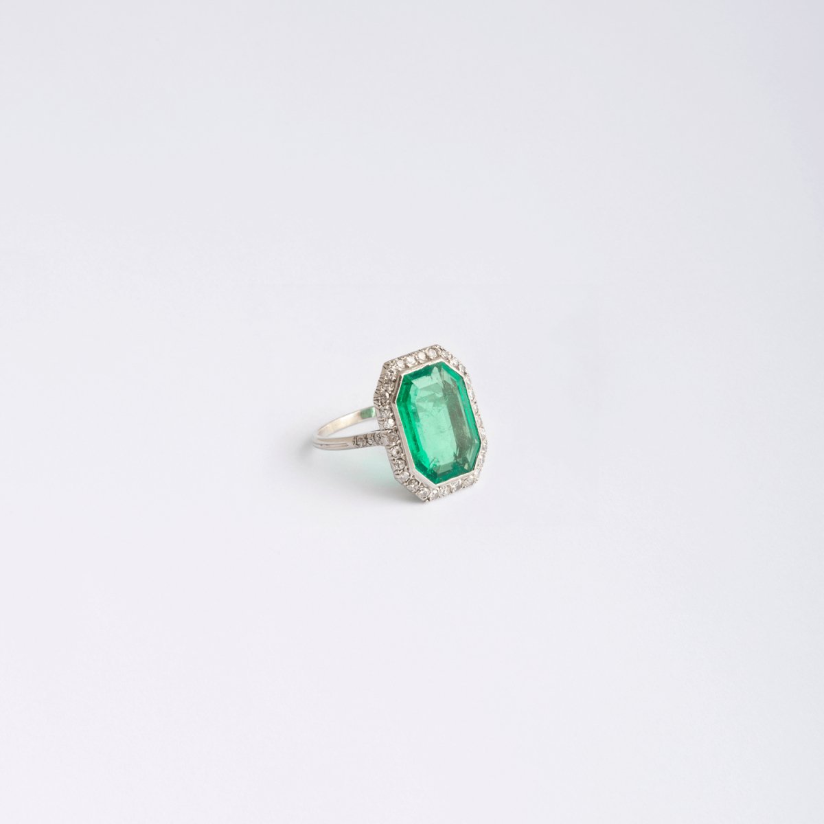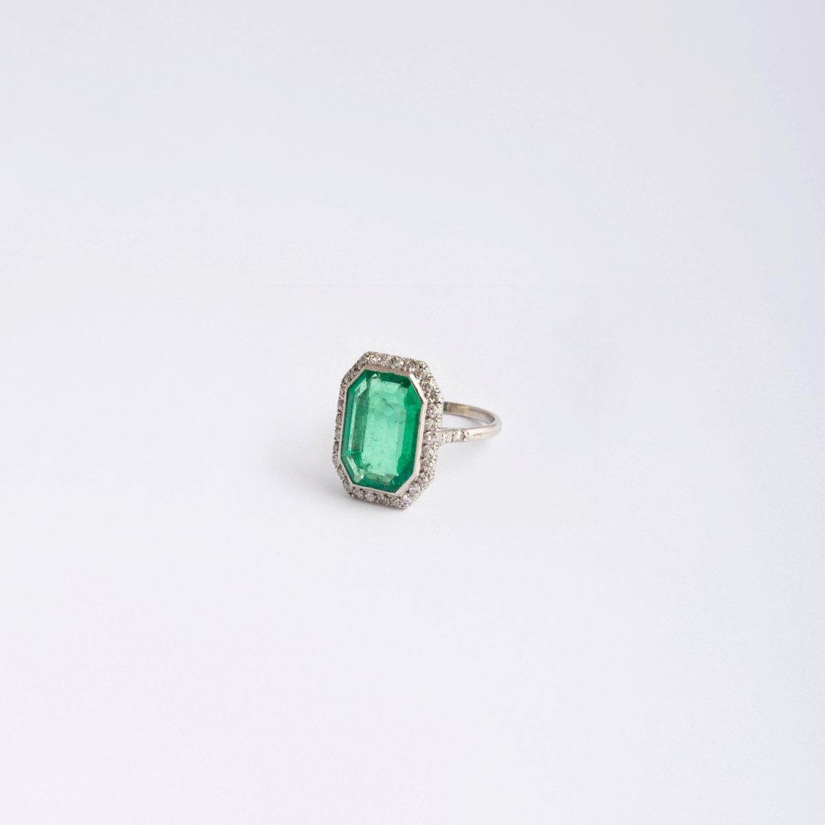Bague en or gris 18 carats, sertie d'une émeraude rectangulaire aux pans coupés et d'un entourage de diamants. Poids brut : 6g. Tour de doigt : 53,5 Poinçon de la Garantie Française et des métaux Précieux. Ref : A2157