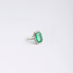 Bague en or gris, sertie d'une émeraude rectangulaire et diamants