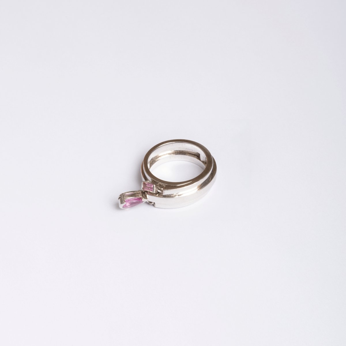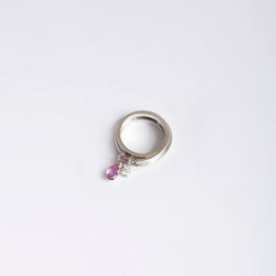 Bague CHAUMET en or blanc 18 carats ornée de trois breloques serties de diamants et saphirs roses. Poids brut : 15 g Tour de doigt : 54