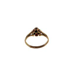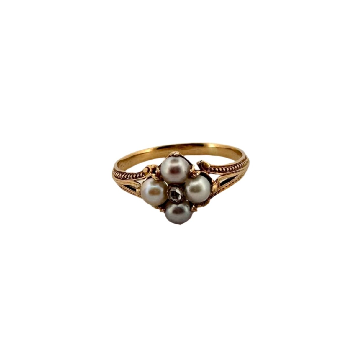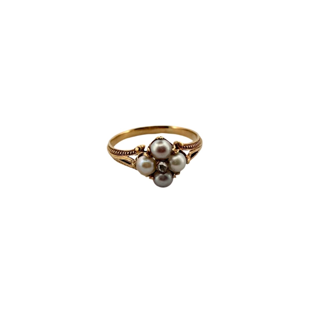 Bague en or jaune 18 carats, l'anneau perlé à décor de rinceaux ornés de 4 demi-perles entourant un petit diamant.Bague Perles et Diamant en Or JaunePoinçon non visible.