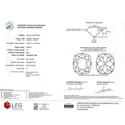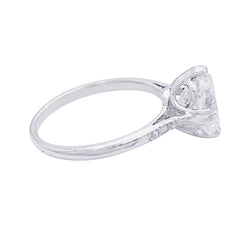 Une bague solitaire en platine 950/000 centrée d'un diamant coussin taille ancienne épaulé au total de six diamants taille ancienne. Poids du diamant principal : 2,19 caratsQualités du diamant principal : G / SI2 Certificat du Laboratoire Français de Gemmologie. Poid du diamand : 2,19 ct Tour de doigt : 52