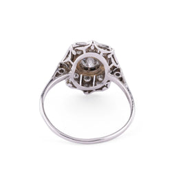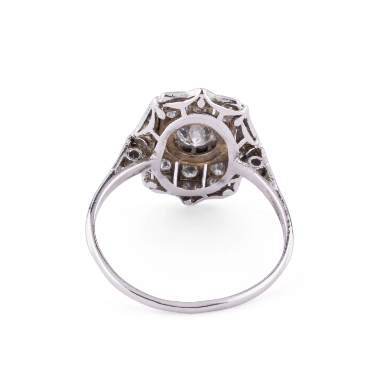 Bague plate de forme rectangulaire des années 1930 en platine et or. Matière : Platine et or Poinçon : Mascaron et Hibou Poids : 3,5 grs Longueur : 2 cm Largeur : 1,5 cm Tour de doigt Modifiable : 58 Nombre carat: 0,20 ct le central Nombre de pierres: 20 pierres Période: 1930