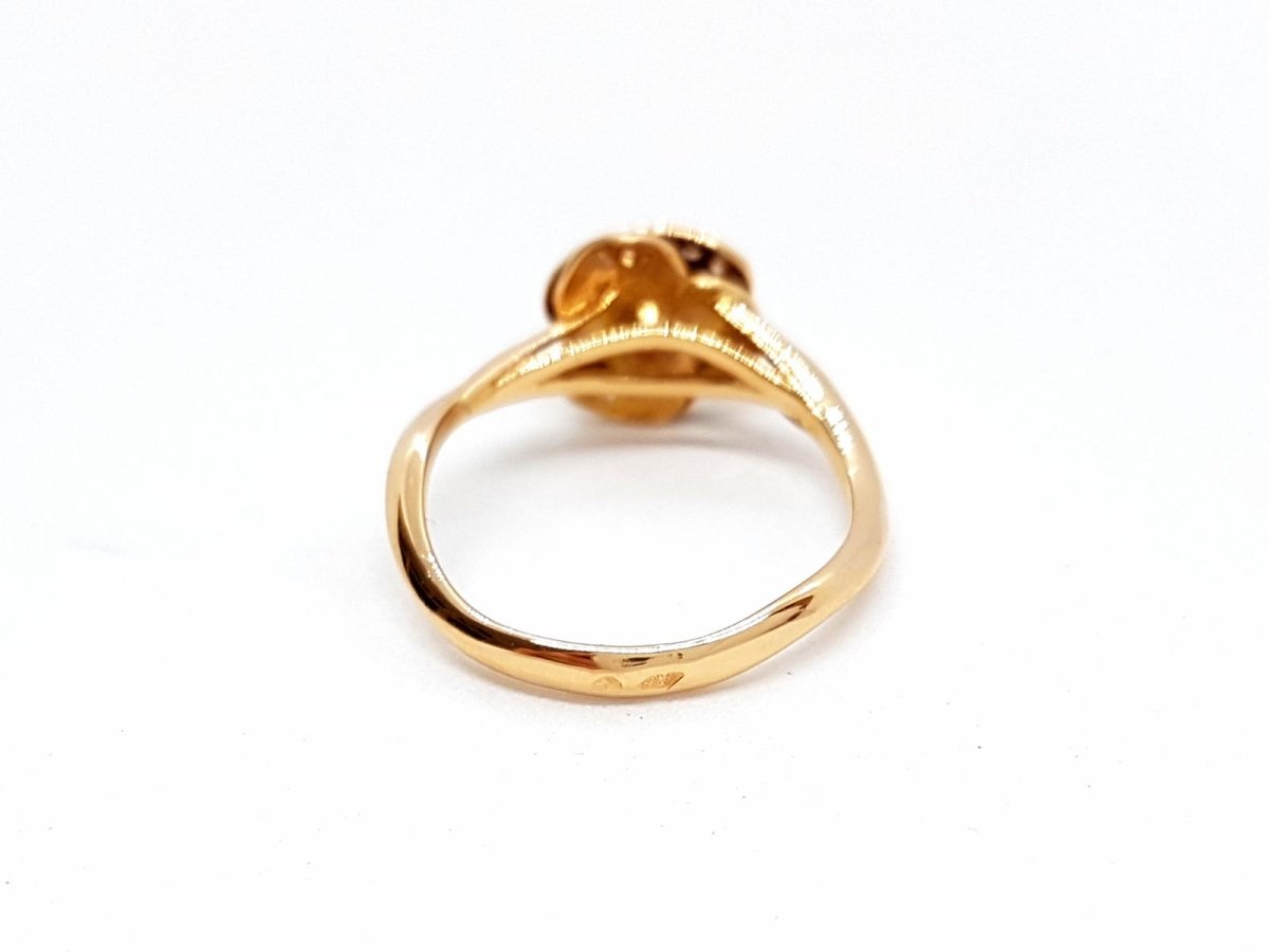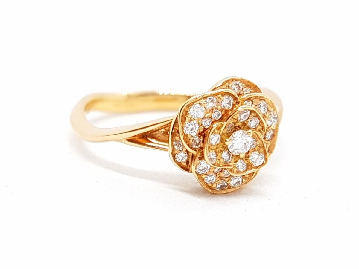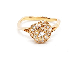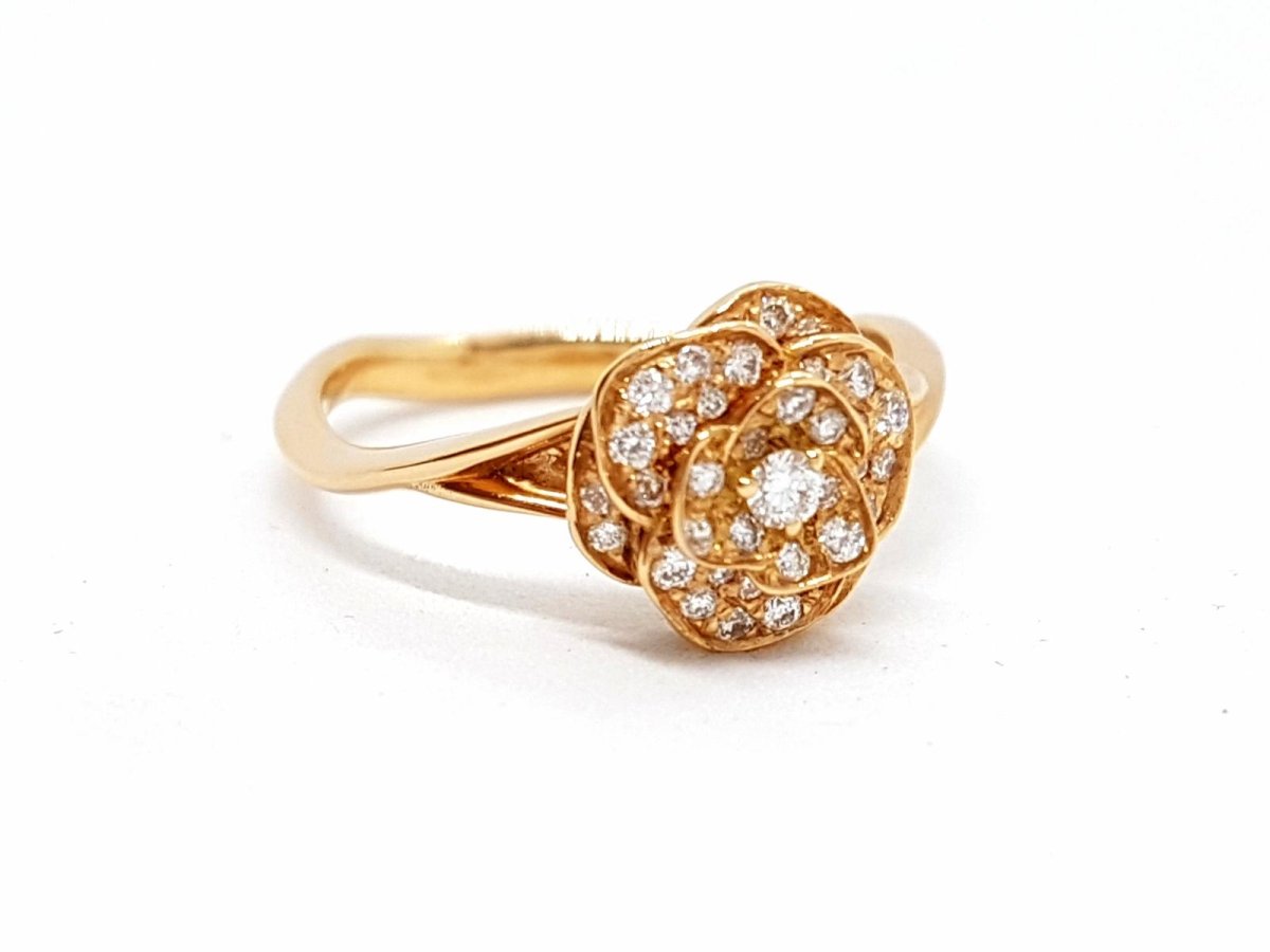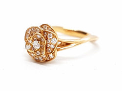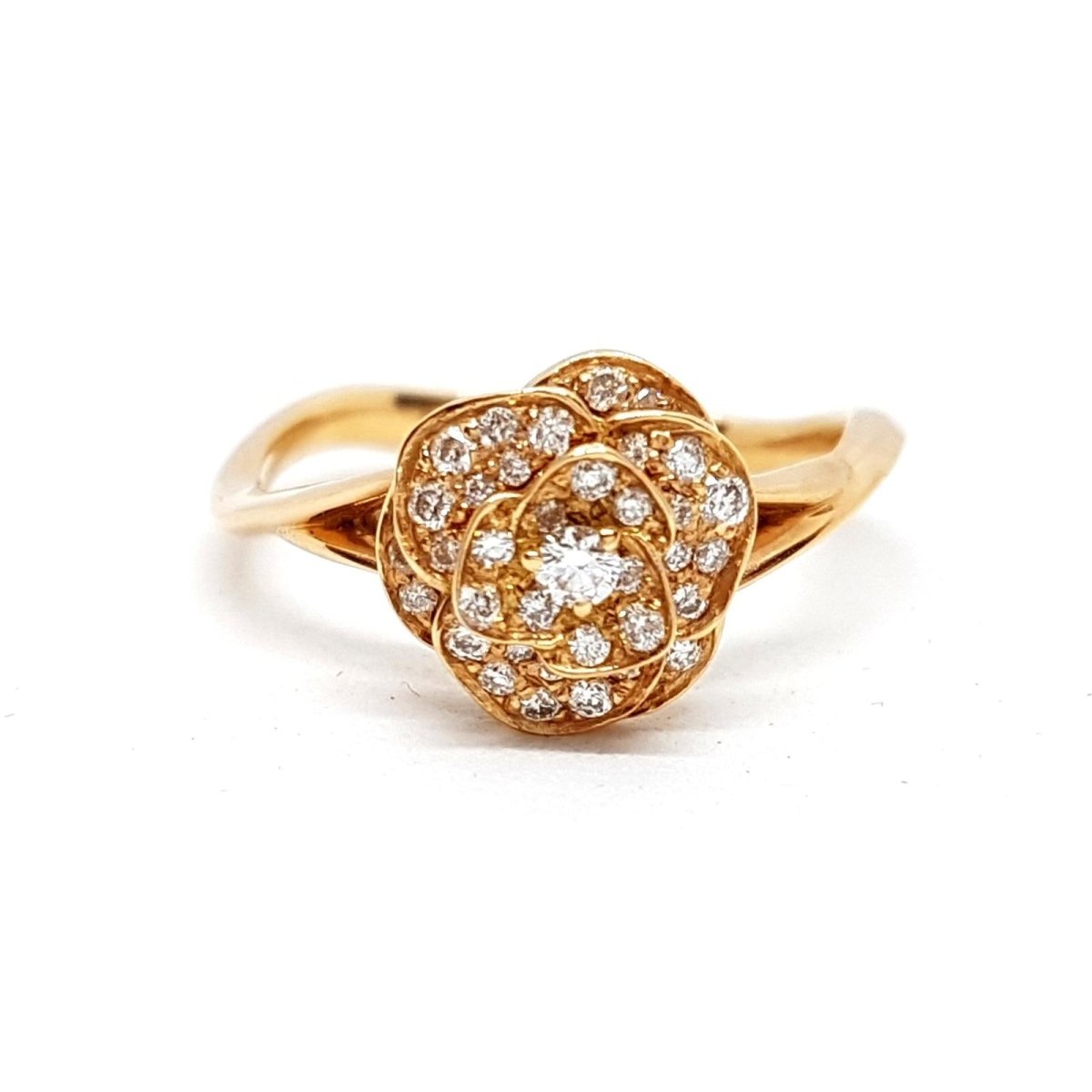 Bague fleur en or rose 750 millièmes (18 carats). pétales pavés de diamants taille brillant pour 0.35 ct au total. anneau avec mouvement de vague. tour de doigt: 53. diamètre de la fleur: 0.97 cm. poids total: 2.82 g. poinçon tête d'aigle. état neuf