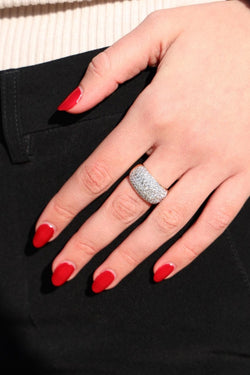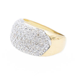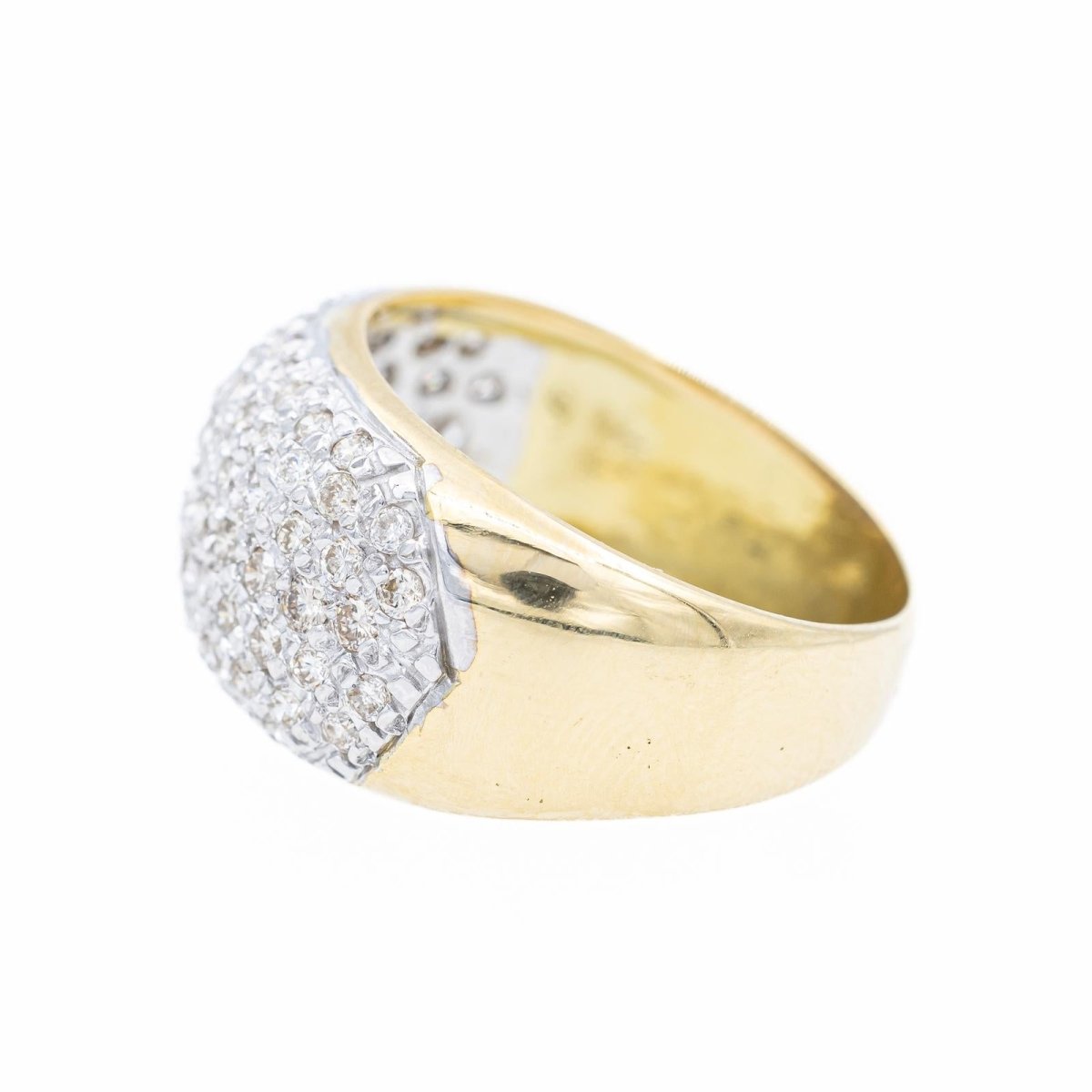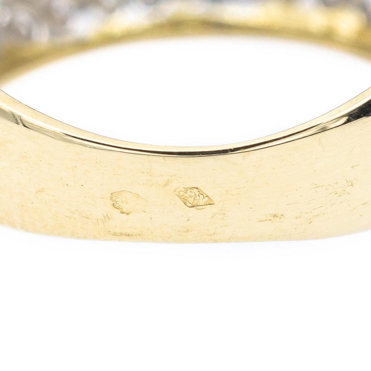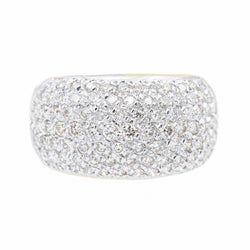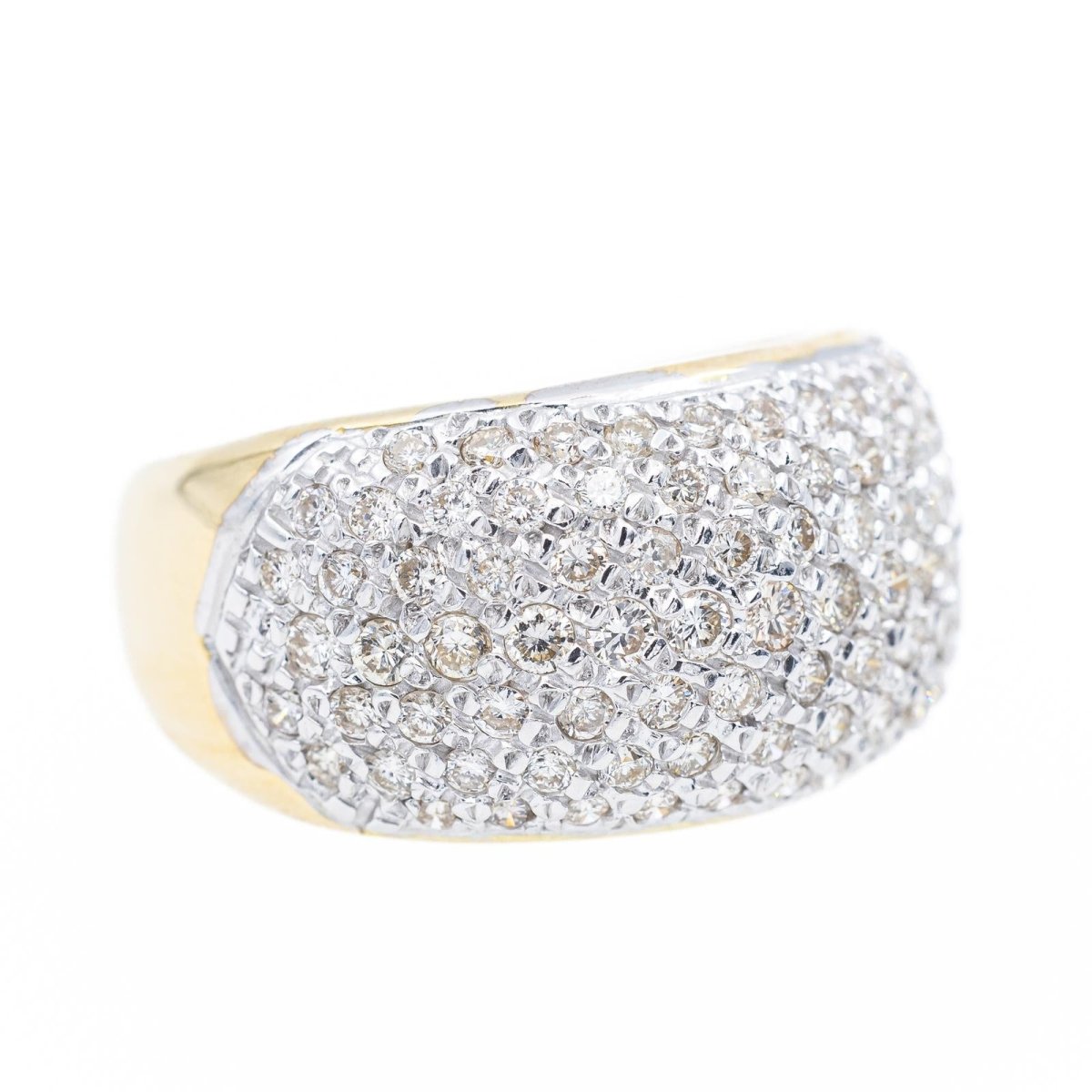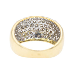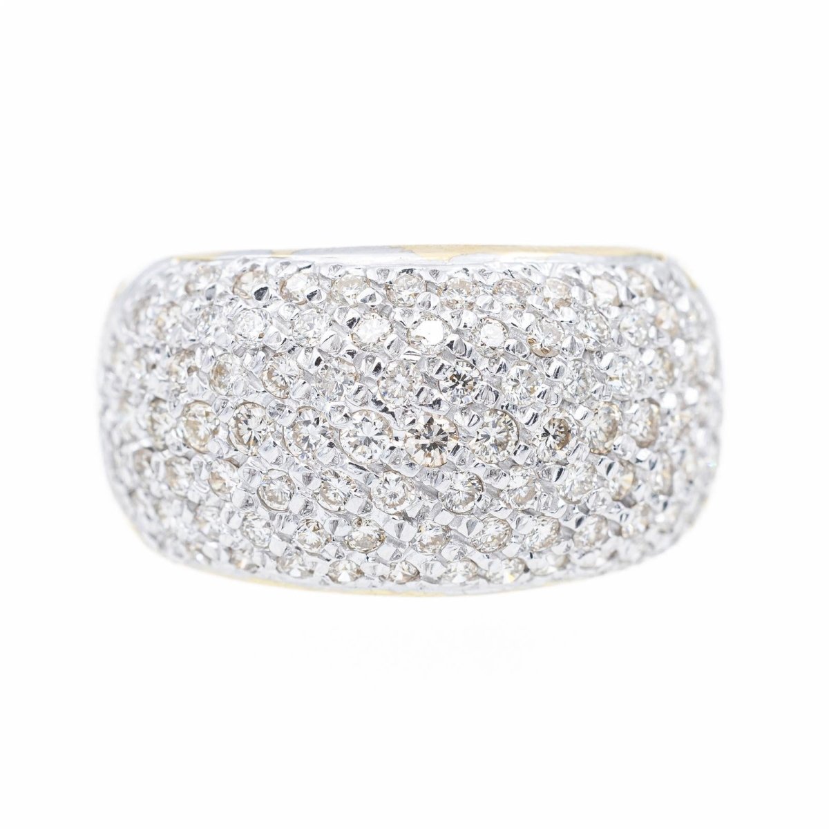 Bague jonc en or jaune et or blanc 750 millièmes (18 carats). sertie d'un pavage de 92 diamants. taille brillant. environ 0.01 ct chacun. Poids total estimé des diamants: 0.92 ct. Tour de doigt: 55. Largeur sur le dessus: 1.15 cm. Poids total: 6.38 g. Poinçon tête d'aigle. Excellent état