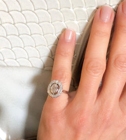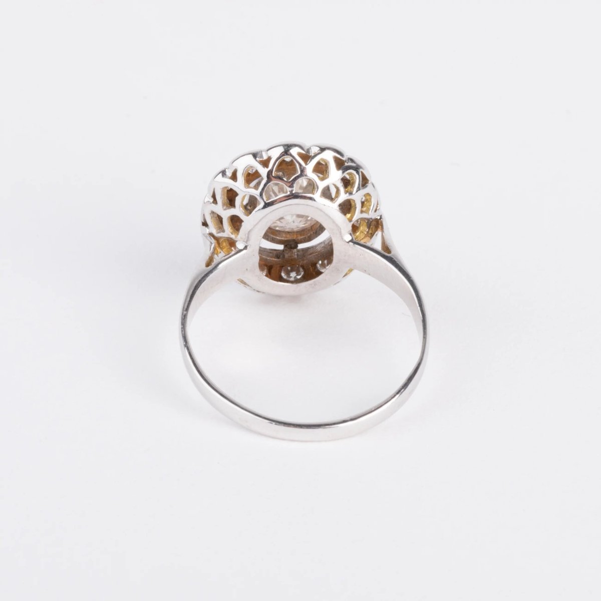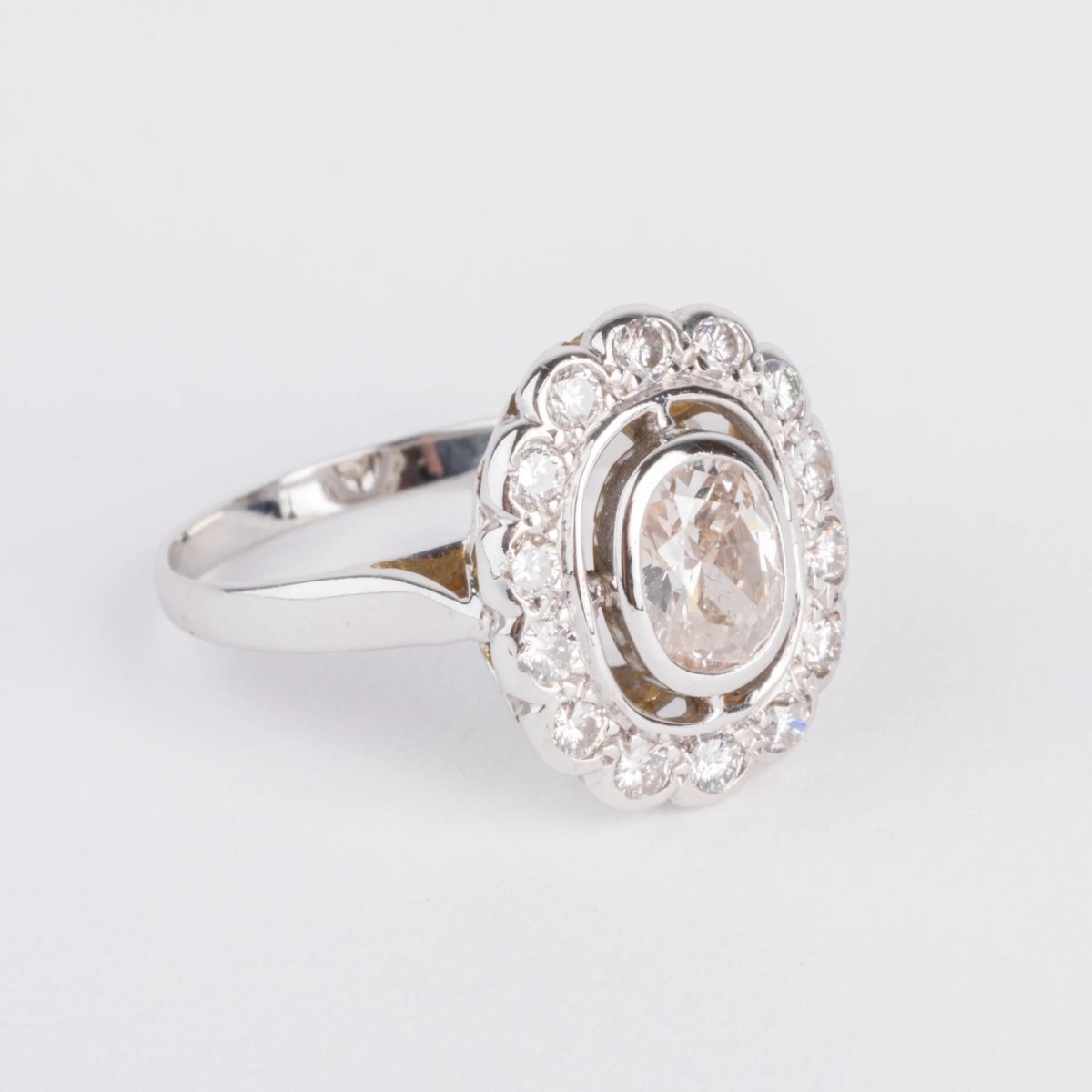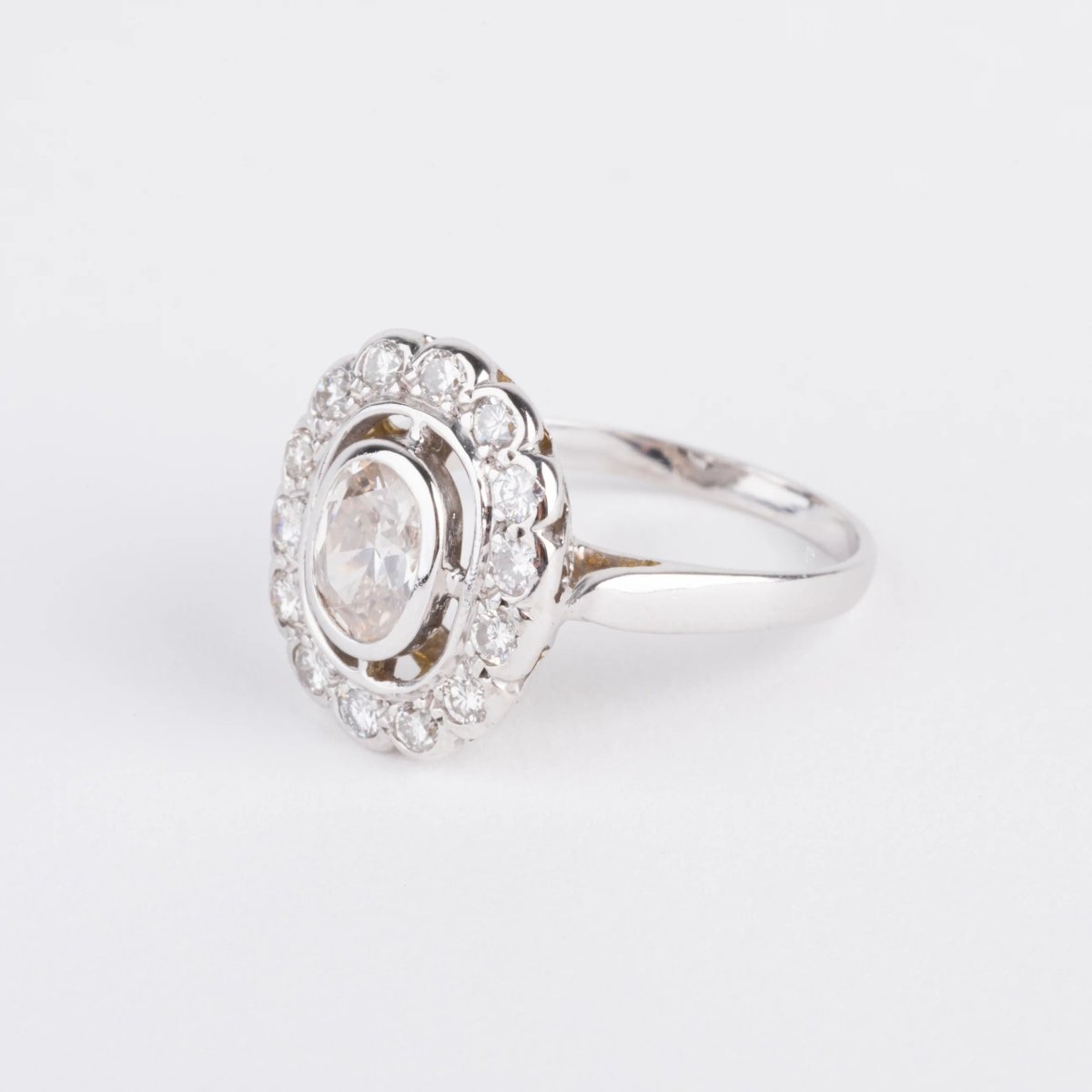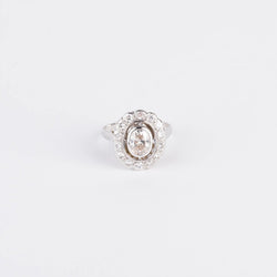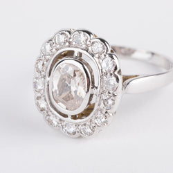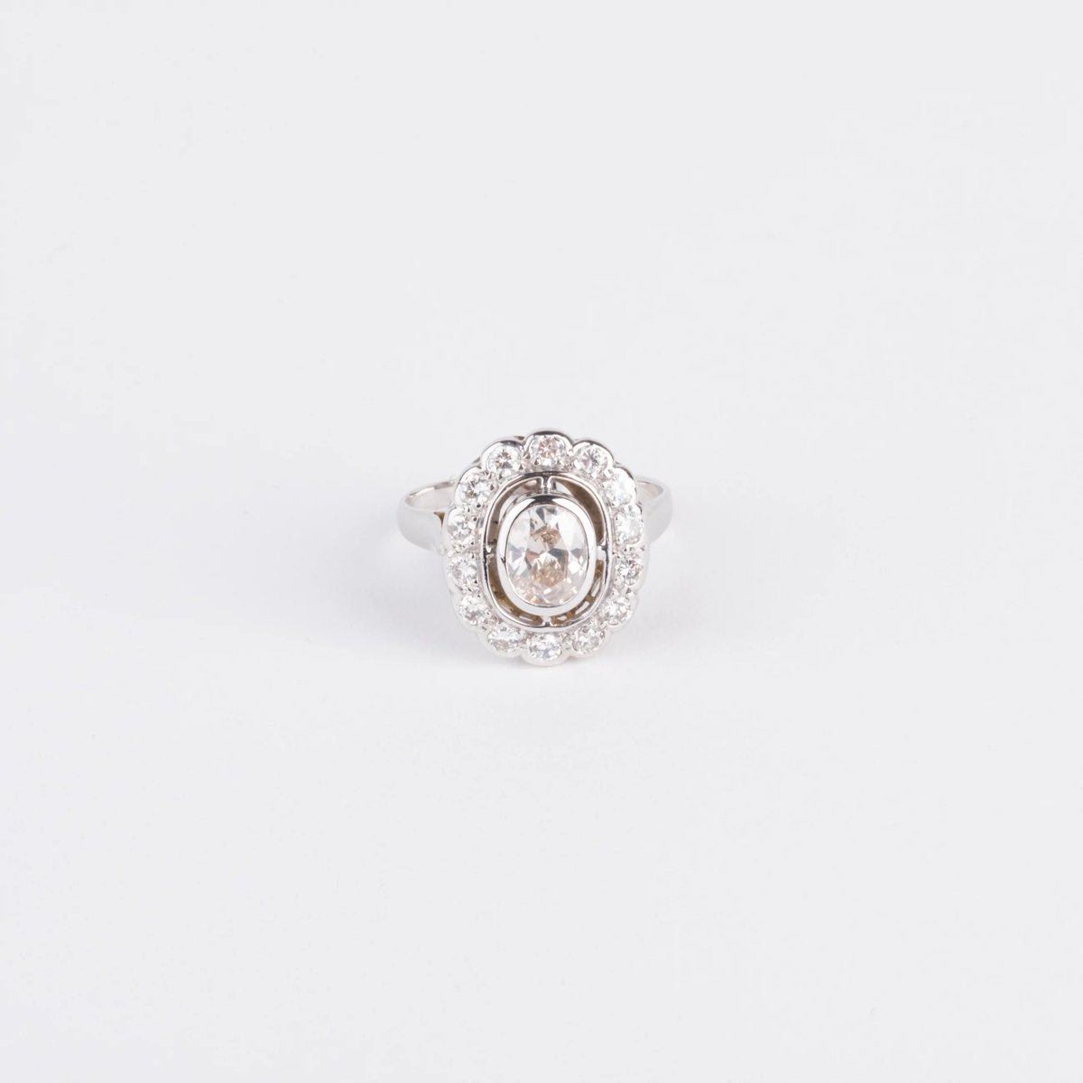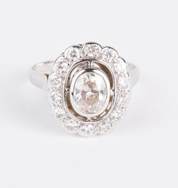 Bague marguerite en or gris ornée d'un diamant central de taille ovale et entourée de diamant. Matière : Or gris 18k Poinçon : Hibou Poids : 3,8grs Longueur : 1,6 cm Tour de doigt Modifiable : 52 Nombre carat: 1cts pierre central & 14 diamants en entourage Nombre de pierres: 15 Période: 1910