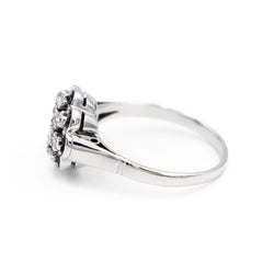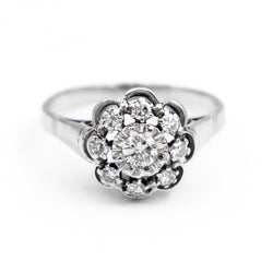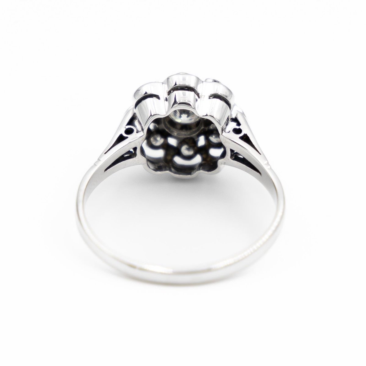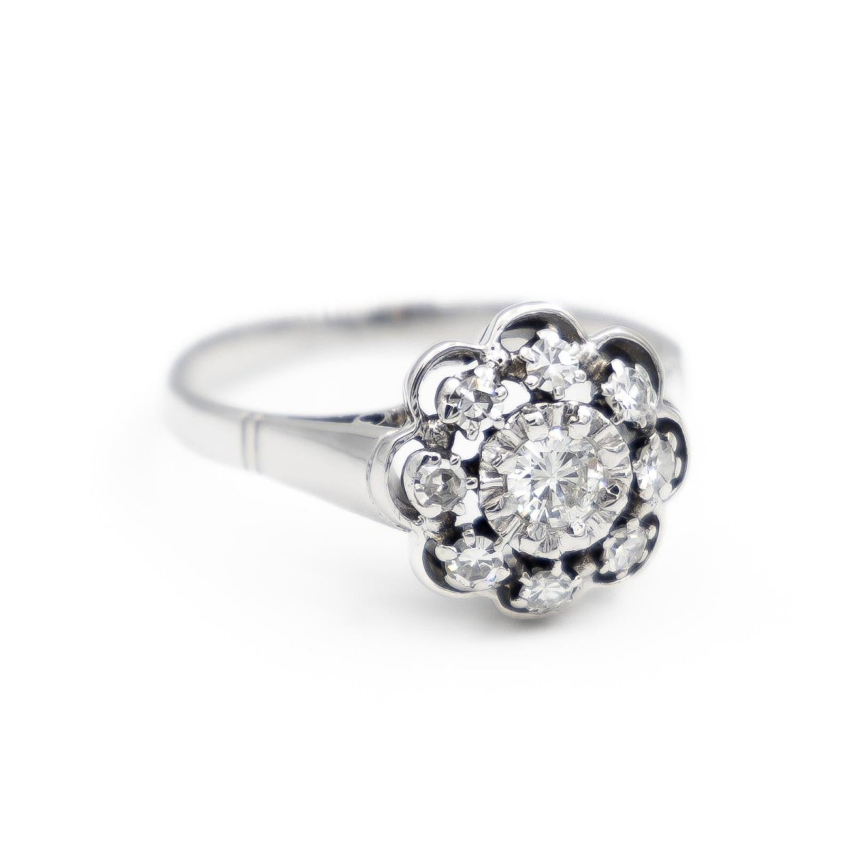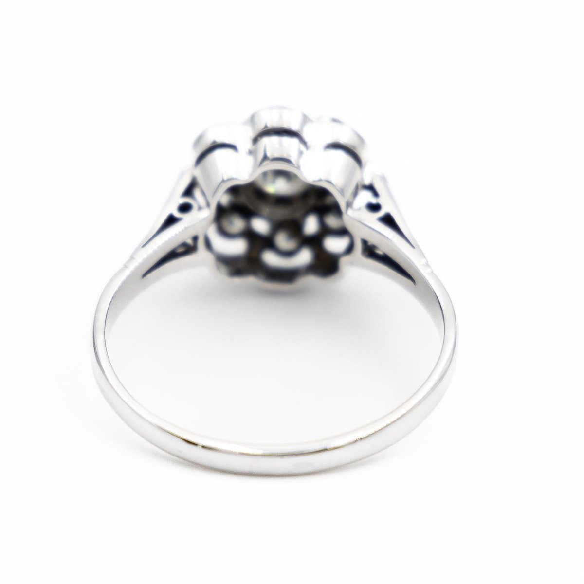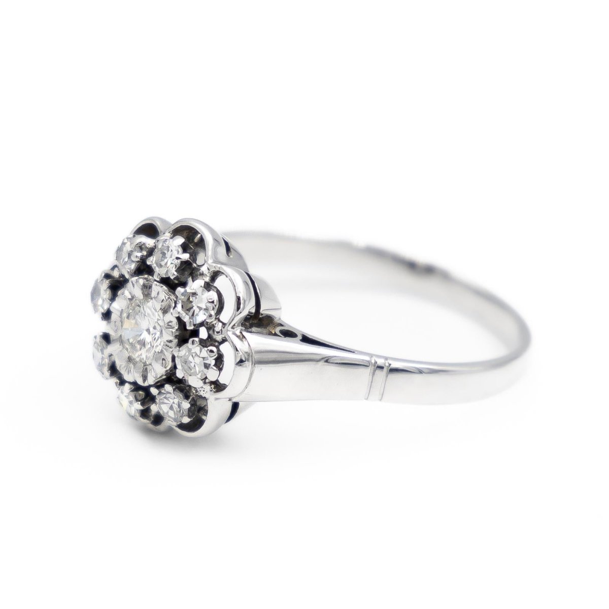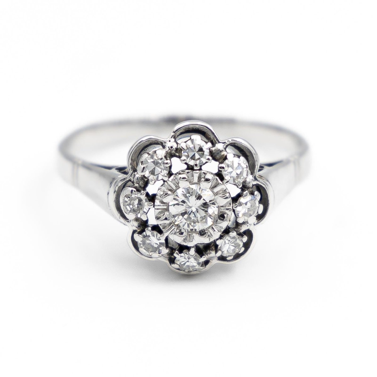 Bague Marguerite en or blanc 750 millièmes (18 carats). sertie d'un diamant central de taille brillant d'environ 0.27 carat. et de 8 diamants taille 8/8. d'environ 0.04 ct chacun. Poids total estimé des diamants: 0.59 ct. Tour de doigt: 64. Largeur sur le dessus: 1.35 cm. Poids total: 4.85 g. Poinçon hibou. Excellent état