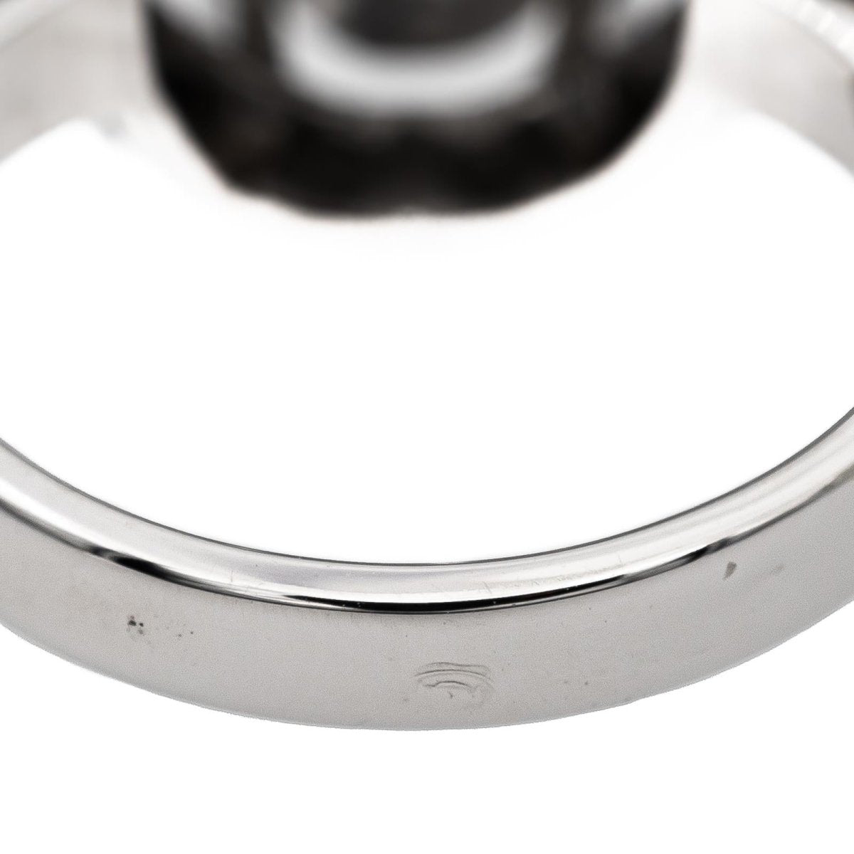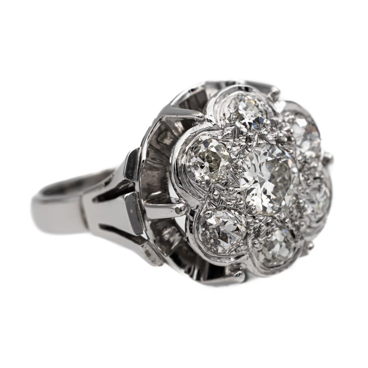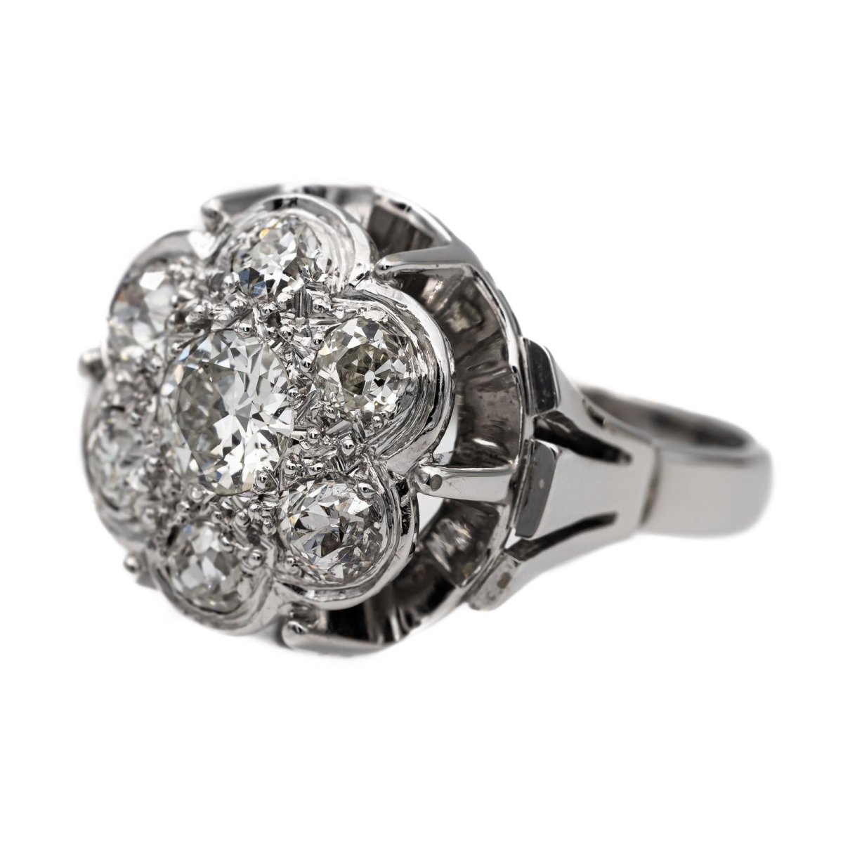 Bague Marguerite en or blanc 750 millièmes (18 carats). sertie de diamants taille ancienne. diamant central environ 0.50 ct et 6 diamants environ 0.15 ct chacun. poids total diamants: environ 1.40 cts. largeur sur le dessus: 1.47 cm. tour de doigt: 47. poids total: 6.38 g. poinçon hibou. excellent état