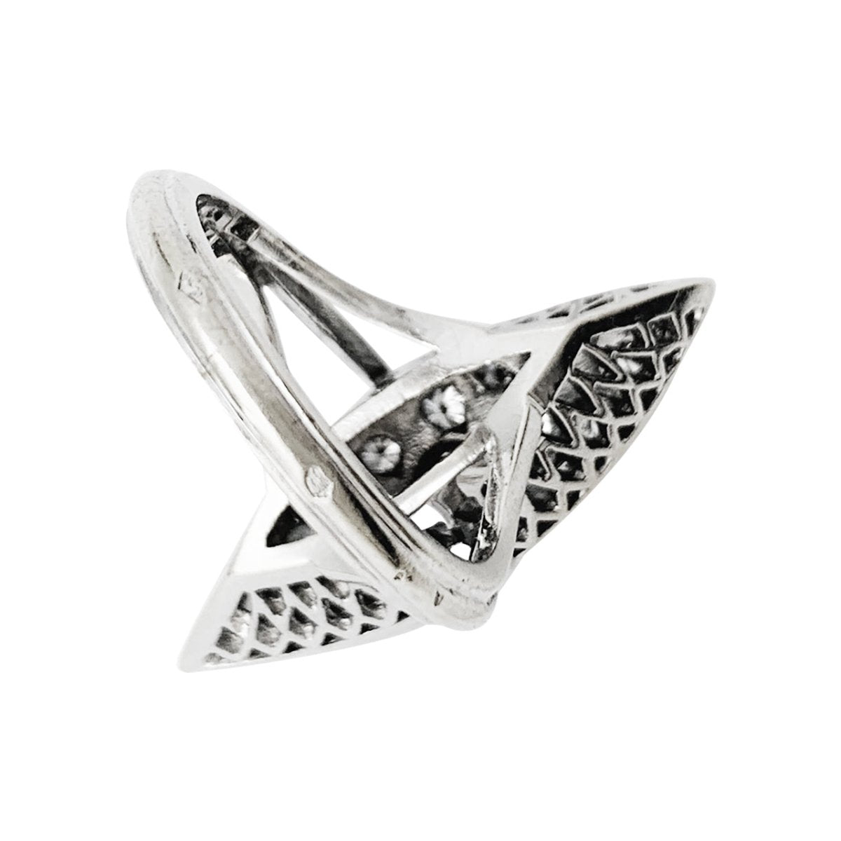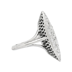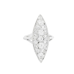 Une bague en or blanc 750/000 forme marquise pavée de diamants taille brillant. Longueur : 28 mm Largeur : 10 mm Hauteur : 7 mm Poids : 8 grammes. Poids du diamant : environ 1 carat Tour de doigt : 53