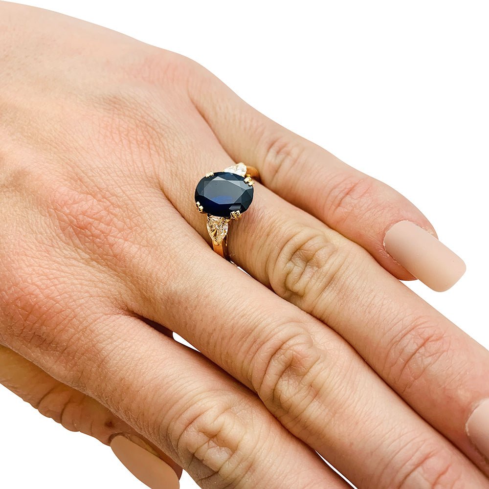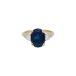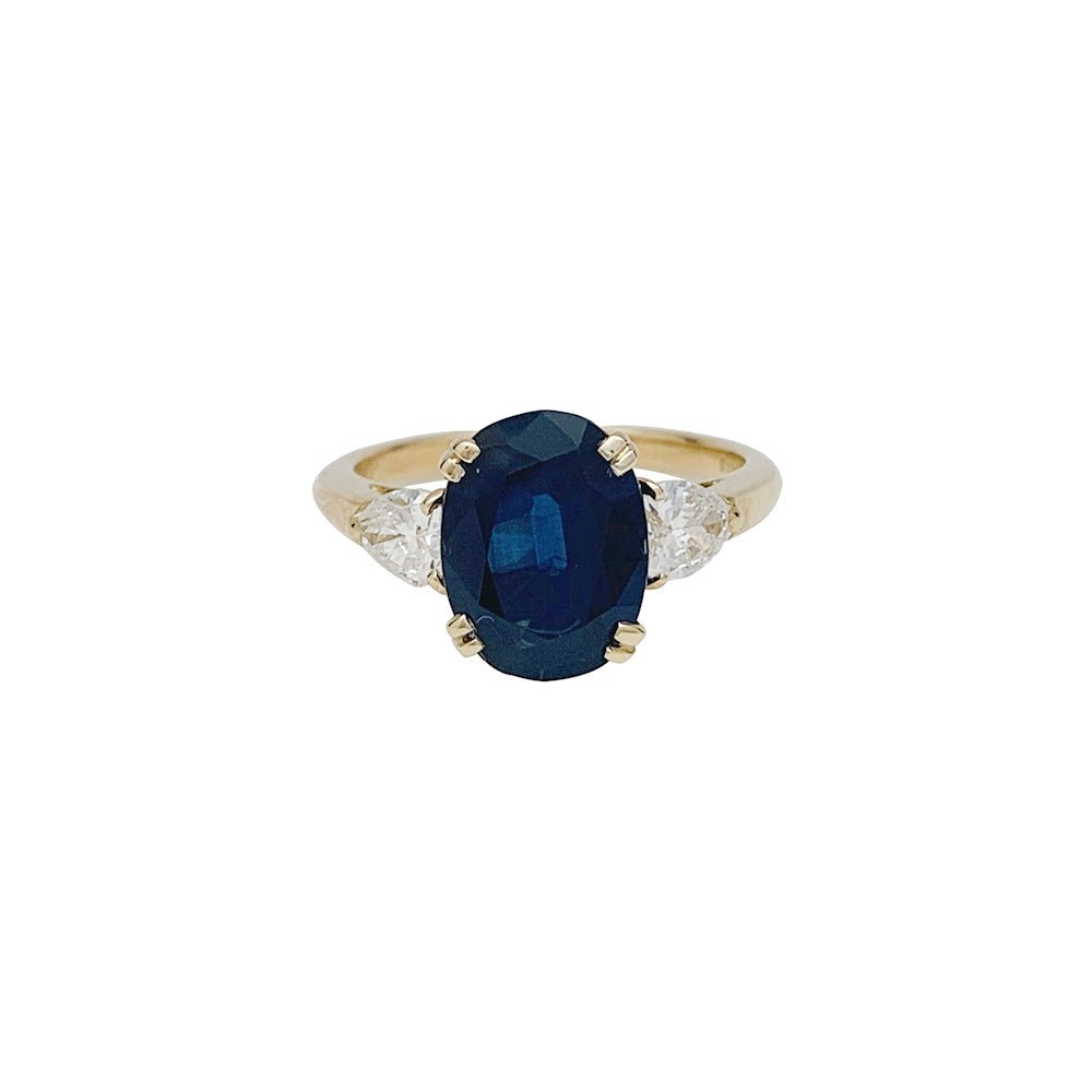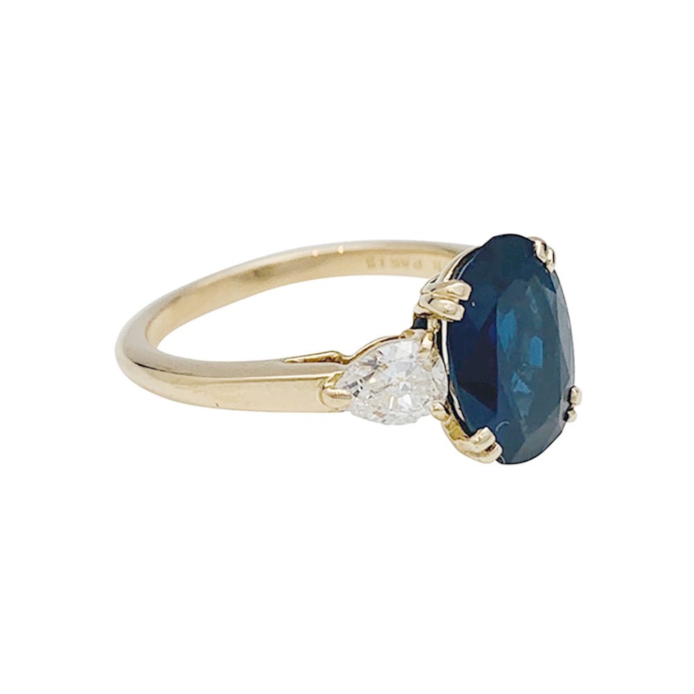 Une bague signée de la Maison Mauboussin, en or jaune 750/000, centrée d’un saphir pesant 3.44 cts, épaulé de 2 diamants taille poire d'un poids total de 0.63ct. Gisement thaïlandais, modification thermique. Poids : 4,5 grammes. Poids du diamant : 0.63 ct au total Tour de doigt : 55