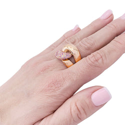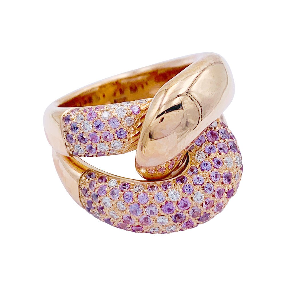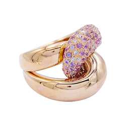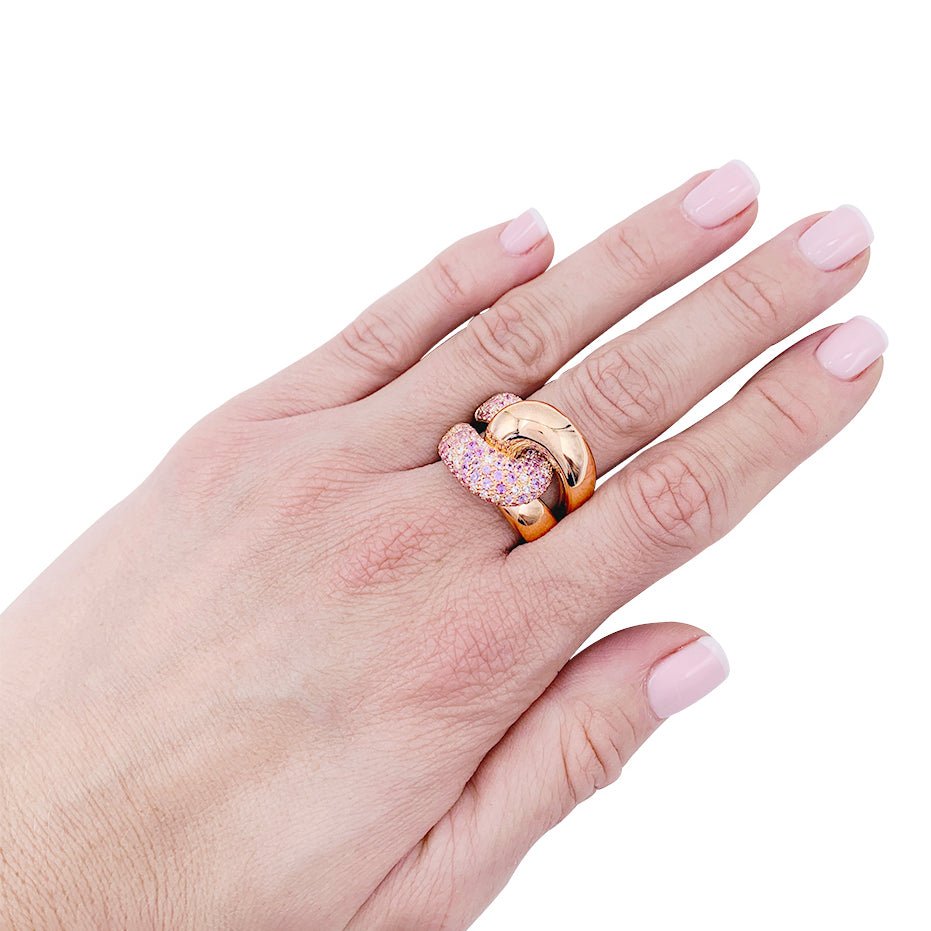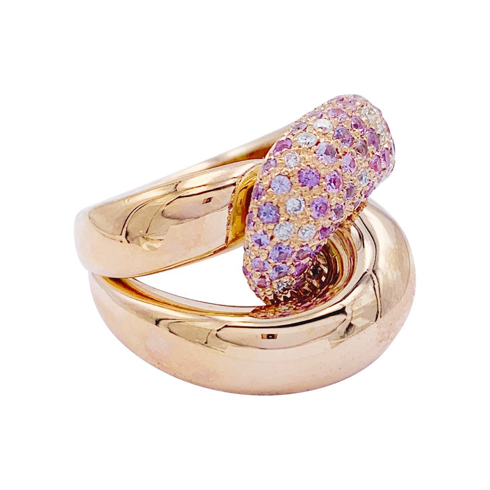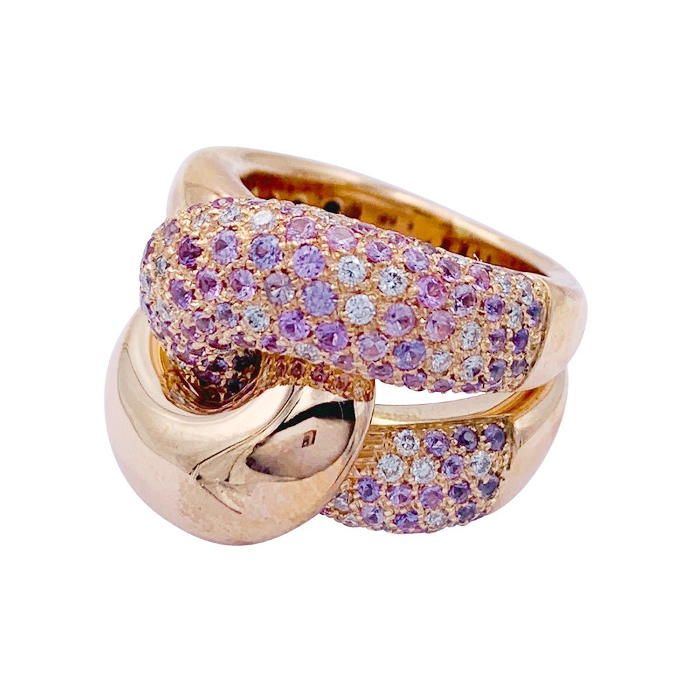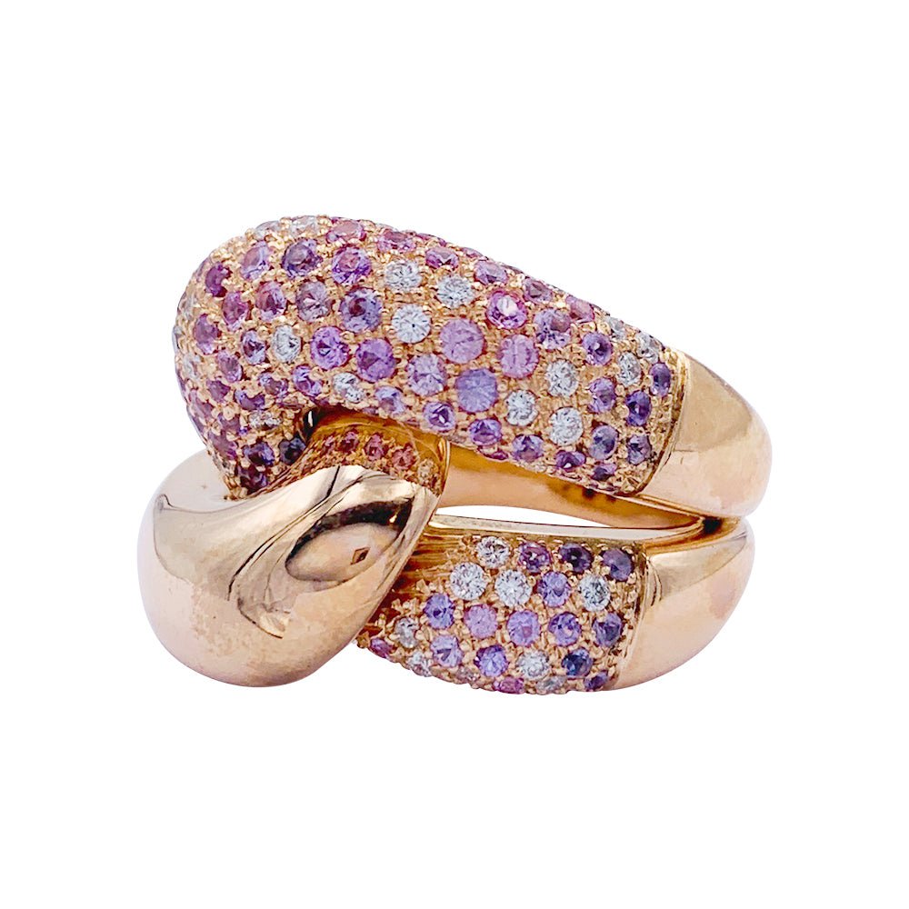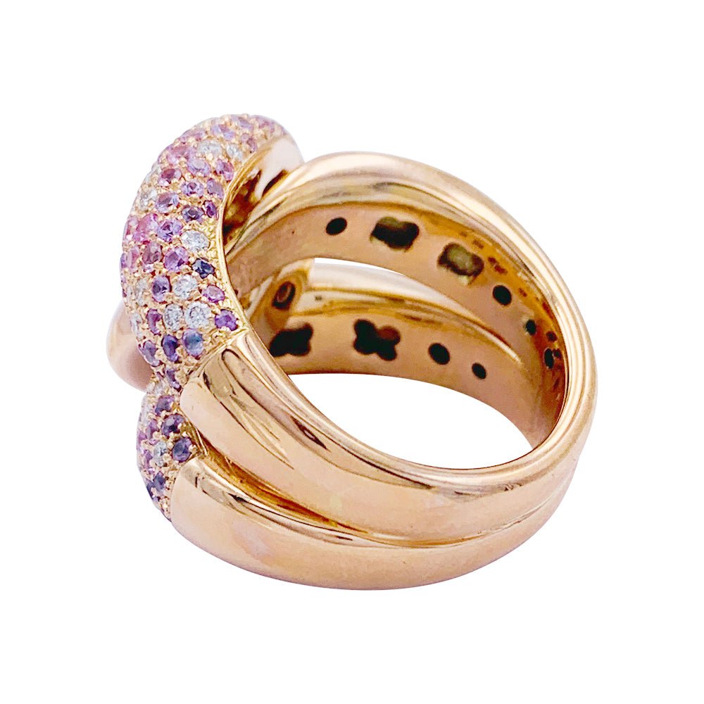 Une bague noeud en or rose 750/000 partiellement sertie de diamants taille brillant et d'un camaïeu de saphirs roses. Largeur : 18 mm Poids : 28,7 grammes Tour de doigt : 55