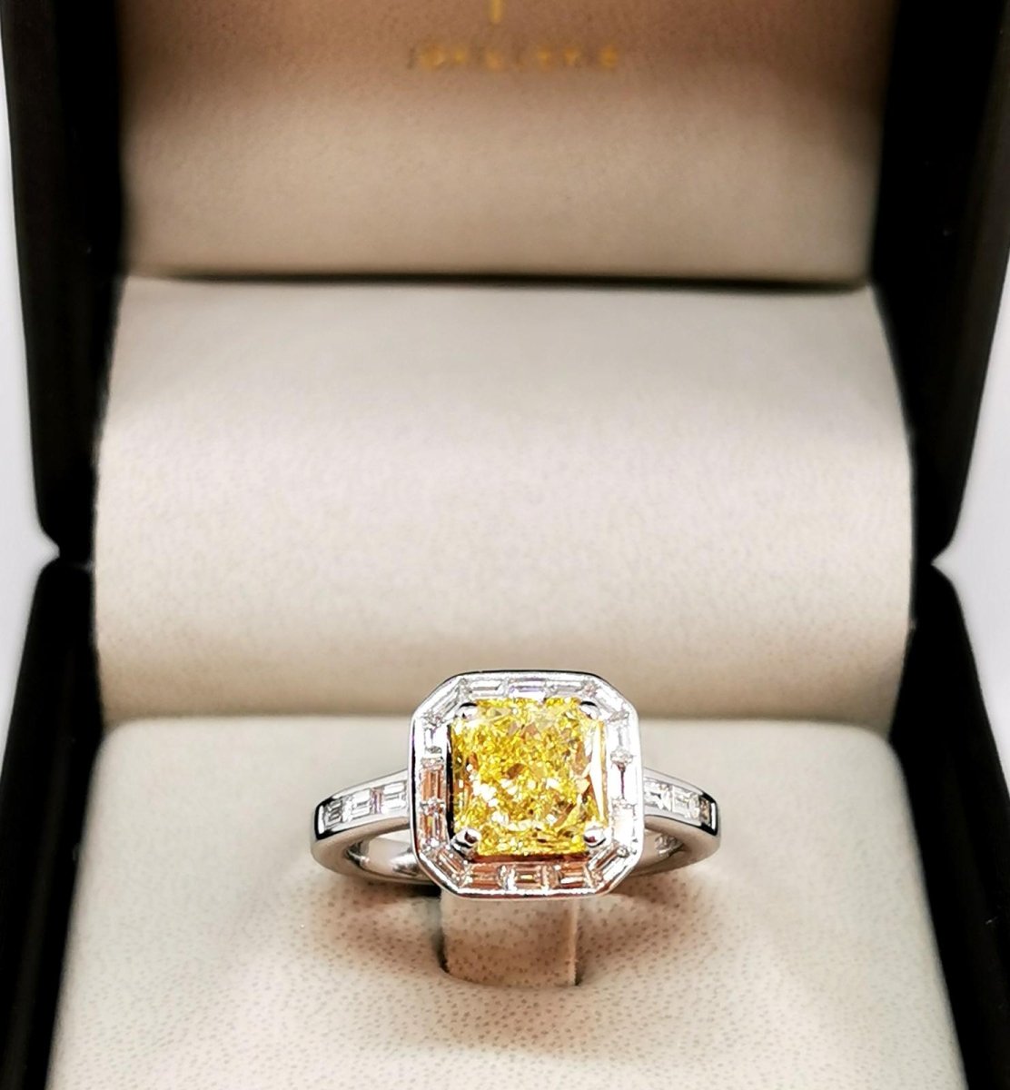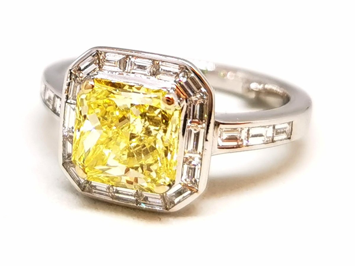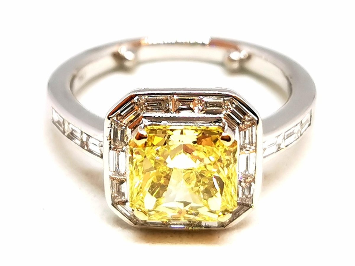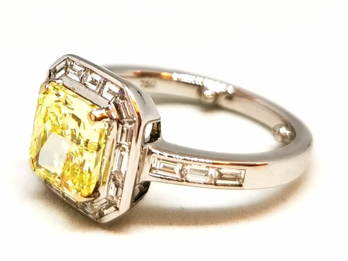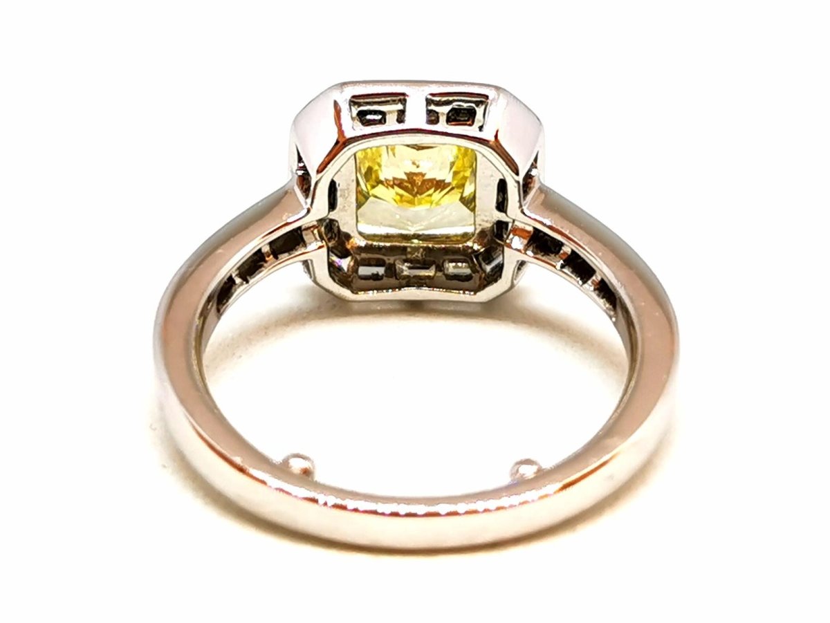 Bague en or blanc 750 millièmes (18 carats). sertie au centre d'un diamant fancy yellow intense. taille radiant. pureté VS1. de 2.02 carats. certifié GIA. épaulé de 21 diamants blanc. taille baguette. d'environ 0.02 ct chacun. poids total diamants blanc: environ 0.42 ct. tour de doigt: 51 (avec deux boules de mise à taille). dimensions motif sur le dessus: 1.14 cm x 1.14 cm. poids total: 4.62 g. poinçon tête d'aigle à demi effacé. excellent état