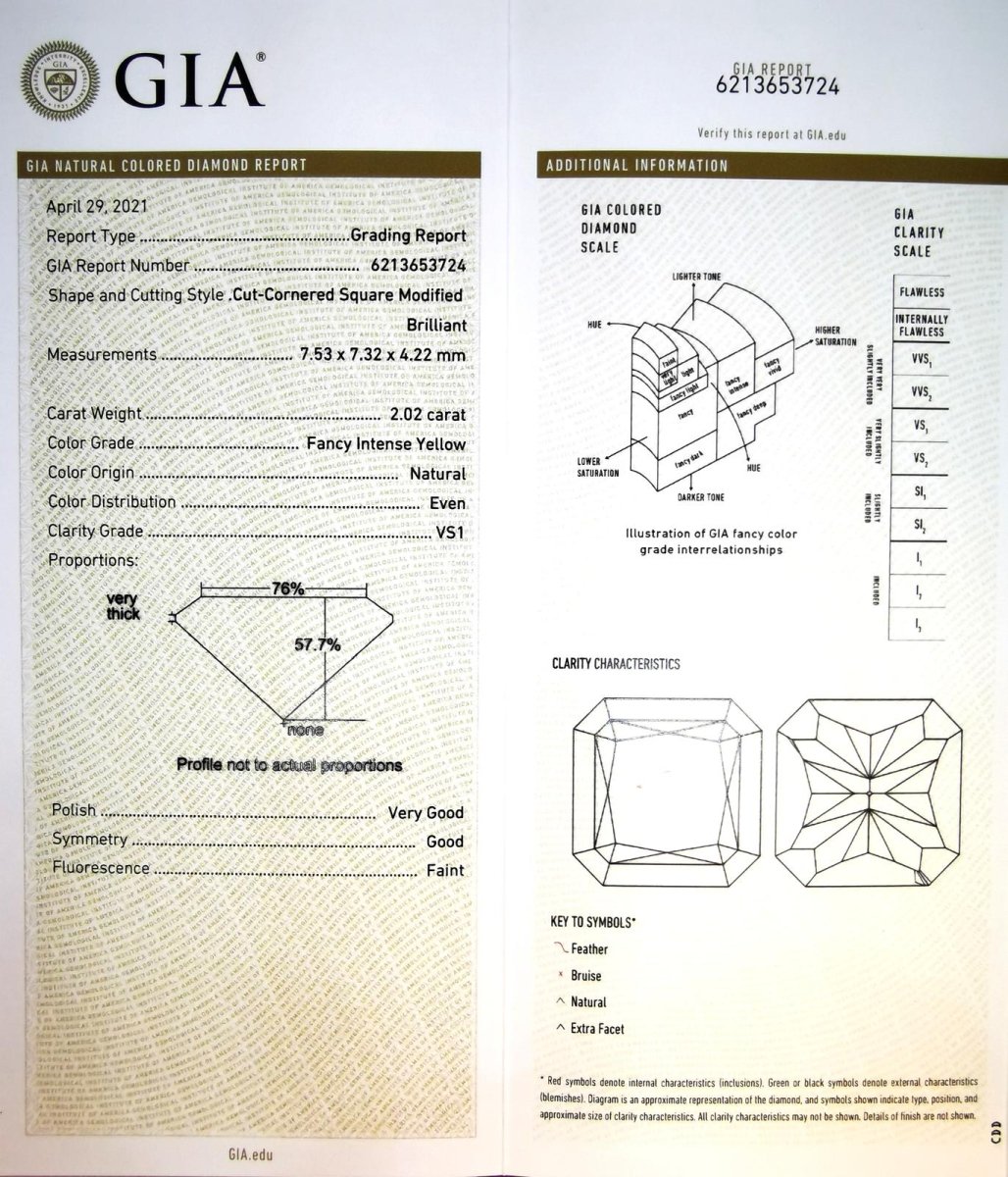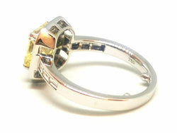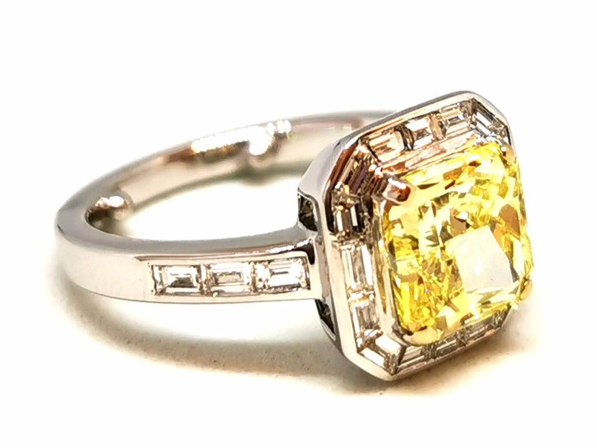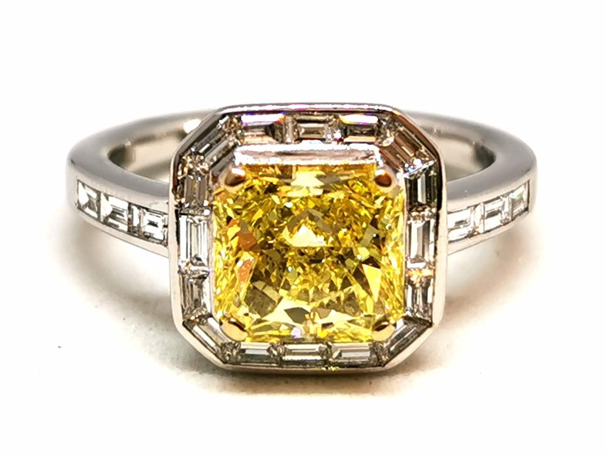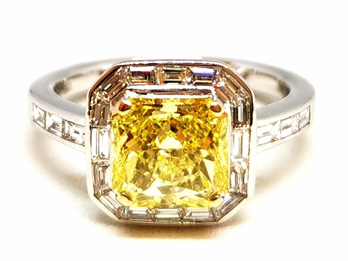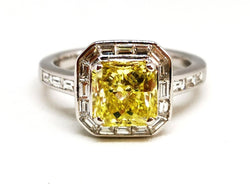 Bague en or blanc 750 millièmes (18 carats). sertie au centre d'un diamant fancy yellow intense. taille radiant. pureté VS1. de 2.02 carats. certifié GIA. épaulé de 21 diamants blanc. taille baguette. d'environ 0.02 ct chacun. poids total diamants blanc: environ 0.42 ct. tour de doigt: 51 (avec deux boules de mise à taille). dimensions motif sur le dessus: 1.14 cm x 1.14 cm. poids total: 4.62 g. poinçon tête d'aigle à demi effacé. excellent état