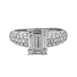 Bague en or blanc 750 millièmes (18 carats). sertie de 5 diamants taille baguette. d'un poids total d'environ 0.43 ct. 88 diamants taille brillant. d'un poids total d'environ 0.79 ct. poids total diamants environ : 1.20 cts. largeur sur le dessus : 0.82 cm. tour de doigt : 50. poids total : 2.95 g. poinçon tête d'aigle. excellent état