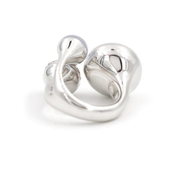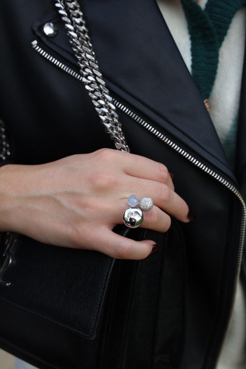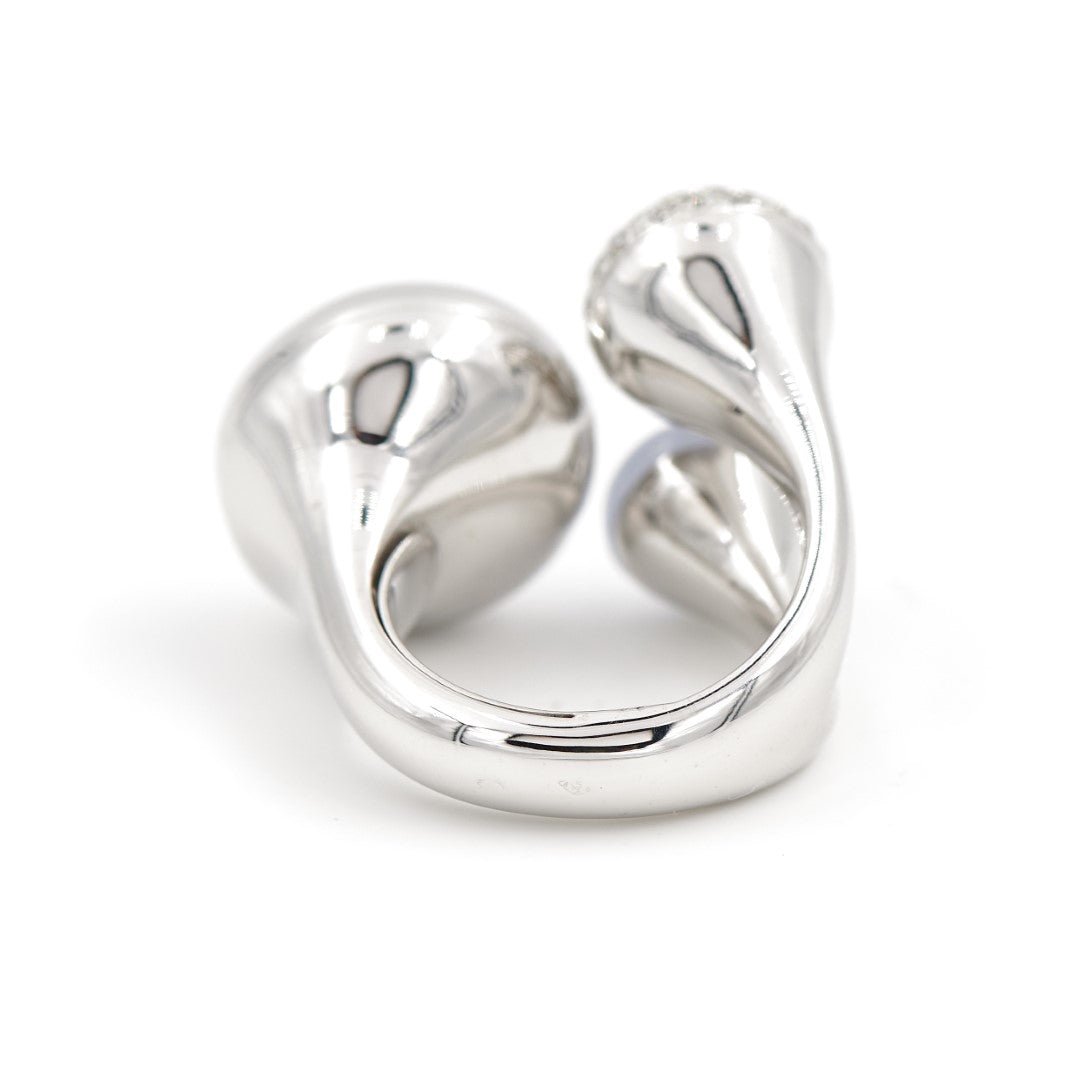 Bague en or blanc 750 millièmes (18 carats). représentant une trilogie composée d'un cabochon rond de calcédoine d'environ 1.30 cts. d'un pavage de 50 diamants. Poids total des diamants: 0.50 ct. et d'une dernière boule en or blanc. Largeur du dessus: 1.86 cm. Tour de doigt : 49. Poids total: 21.68 g. Poinçon tête d'aigle. Excellent état
