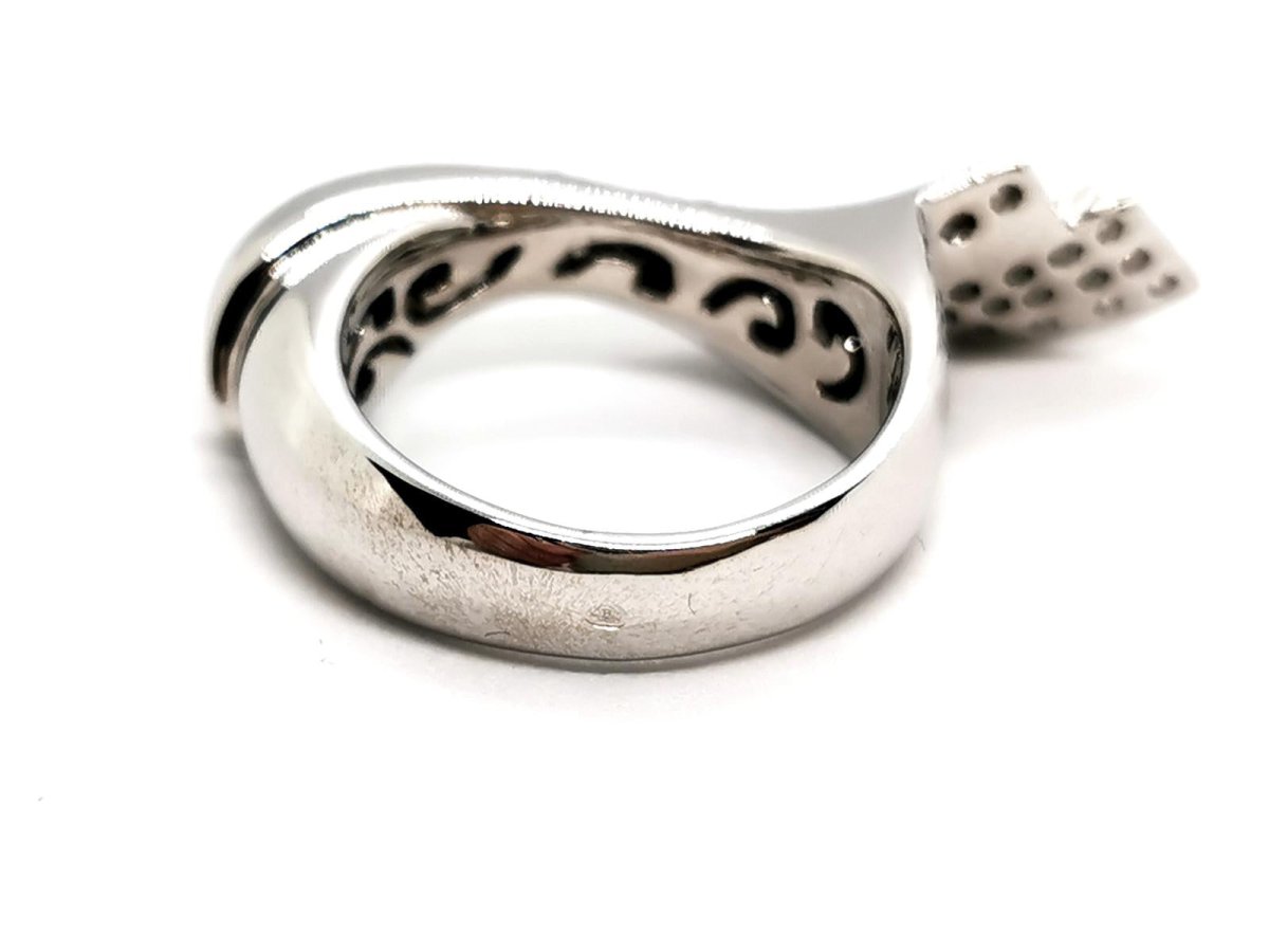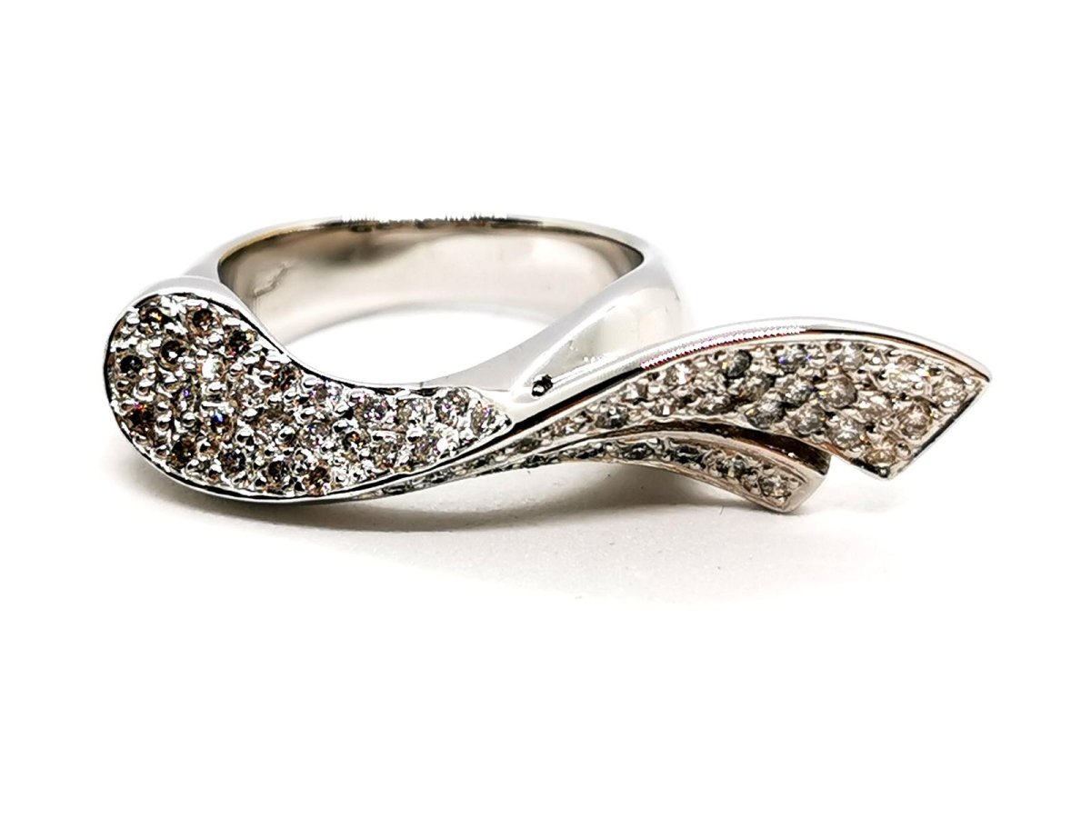 Bague diamants en or blanc 750 milièmes (18 carats). forme de vague. sertie de 55 diamants brillants. poids total diamants: environ 0.494 ct. largeur sur le dessus: 0.94 cm. tour de doigt: 54. poids total: 11.61 g. poinçon Hibou. excellent état.