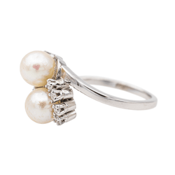Bague en or blanc 750 millièmes (18 carats). sertie de 2 perles de culture. taille ronde. de 6.61 mm. et de 8 diamants. taille huit/huit. d'un poids total d'environ 0.16 ct. (chaque diamant d'un poids d'environ 0.02 ct). largeur sur le dessus : 1.18 cm. tour de doigt : 54. poids total : 4.95 g. poinçon tête d'aigle. excellent état