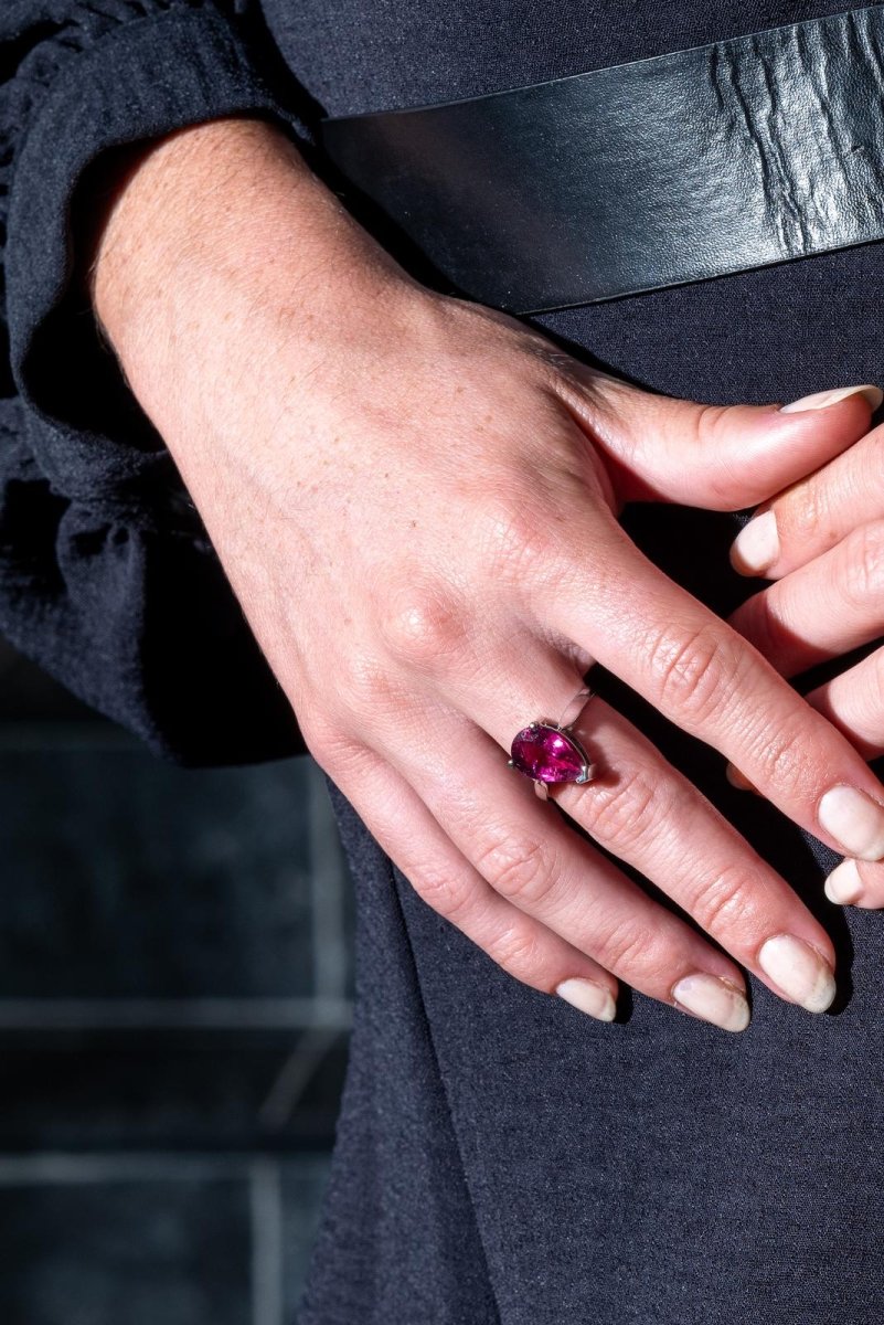 Magnifique bague en or blanc 750 millièmes (18 carats). sertie d'une rubélite taillée en poire de 3.80 carats (13.9 mm x 9.1 mm). taille: 59. dimensions sur le dessus: 1.53 cm x 0.93 cm. poids total: 4.54 g. poinçon tête d'aigle. état neuf