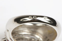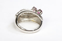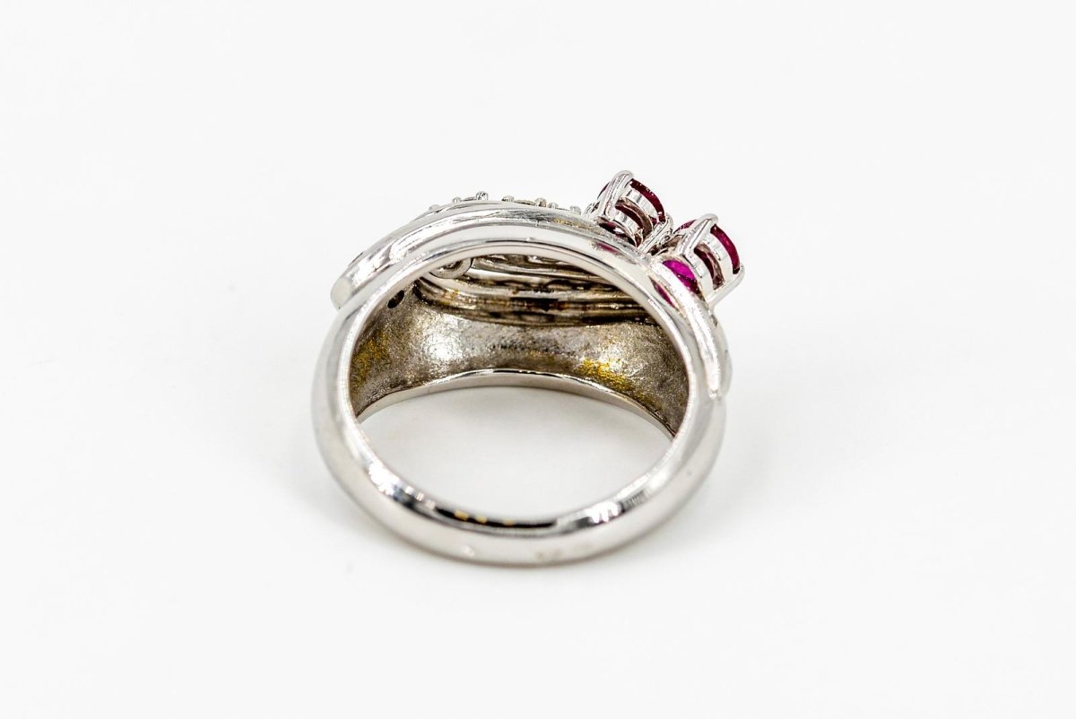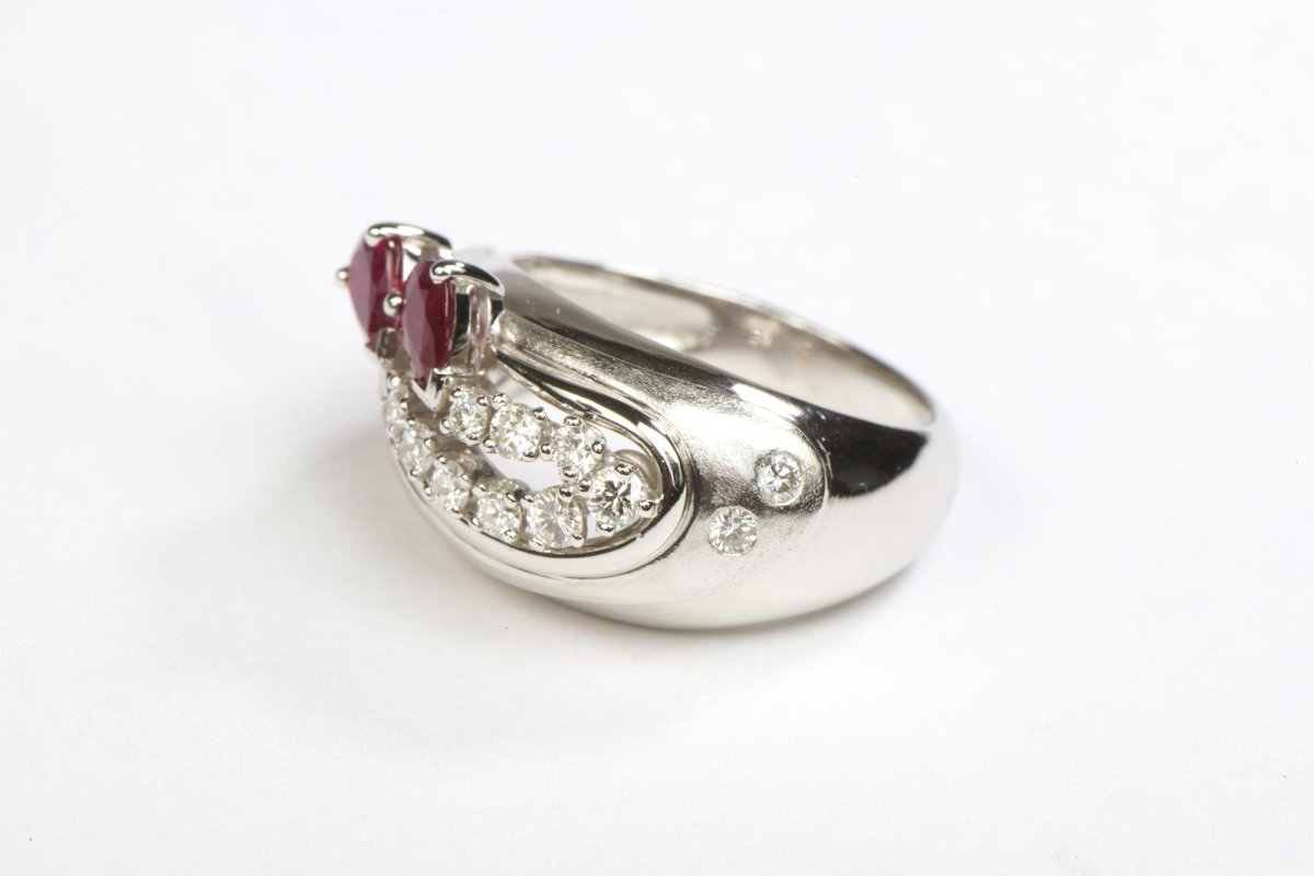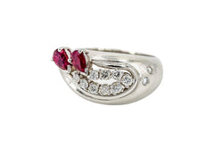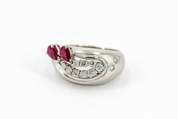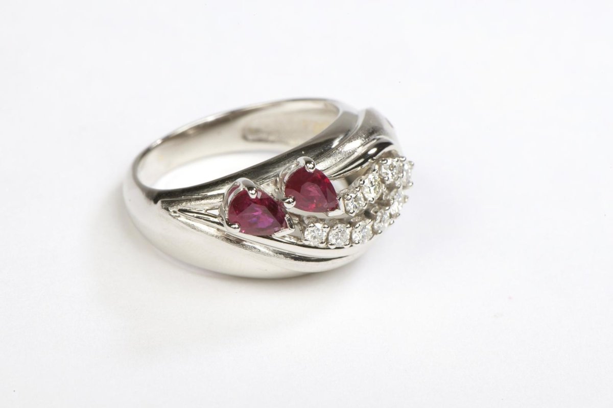 Bague en platine et or blanc 750 millièmes (18 carats). sertie de 2 rubis taillés en poire d'environ 0.40 carat et de 9 diamants (entre 1.8 mm et 1.9 mm de diamètre) taille brillant. pour environ 0.25 carat au total. largeur sur le dessus: 1.1 cm. Poids total : 9.40 g. Taille de doigt: 51. Poinçons tête de chien et tête d'aigle. Excellent état
