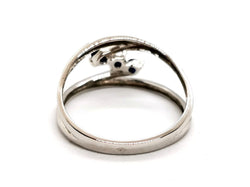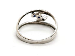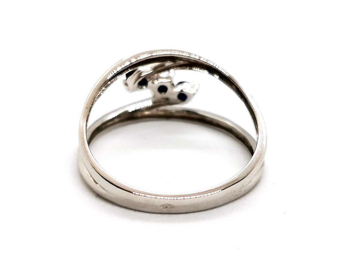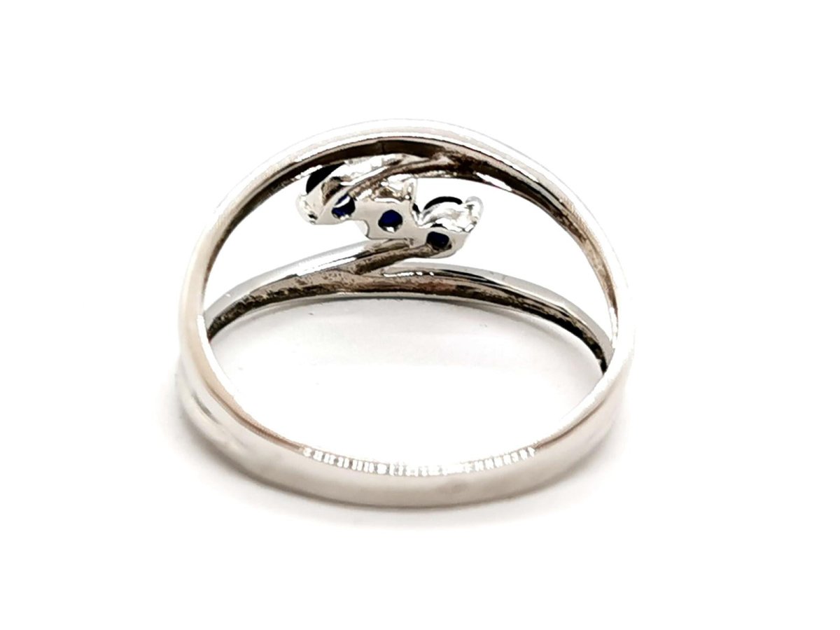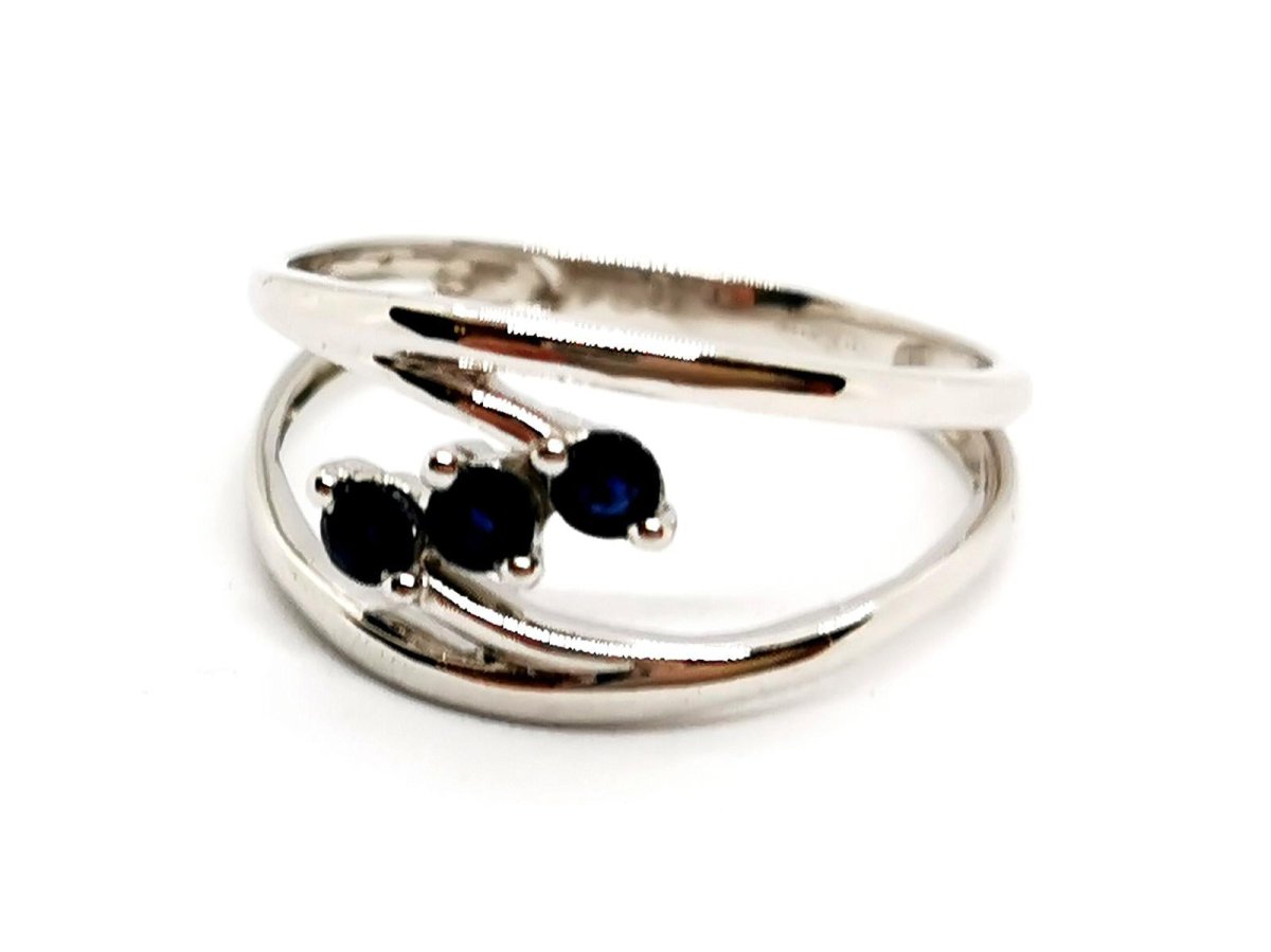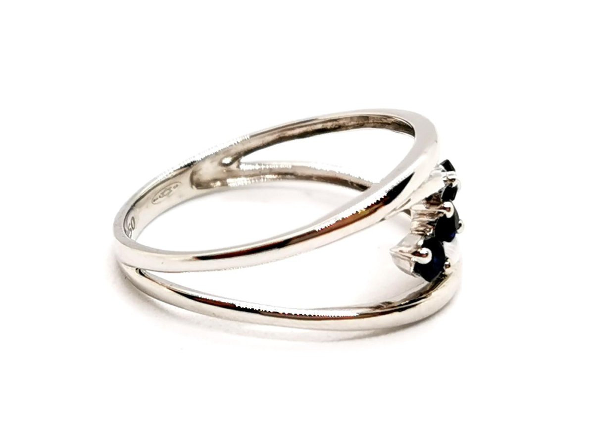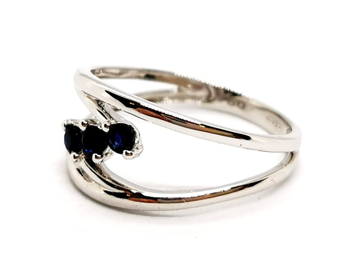 Bague en or blanc 750 millièmes (18 carats). sertie de 3 saphirs taille brillant. d'environ 0.06 ct chacun. poids total saphirs: environ 0.18 ct. tour de doigt: 58. largeur sur le dessus: 1.02 cm. poids total: 2.95 g. poinçon tête d'aigle. état neuf