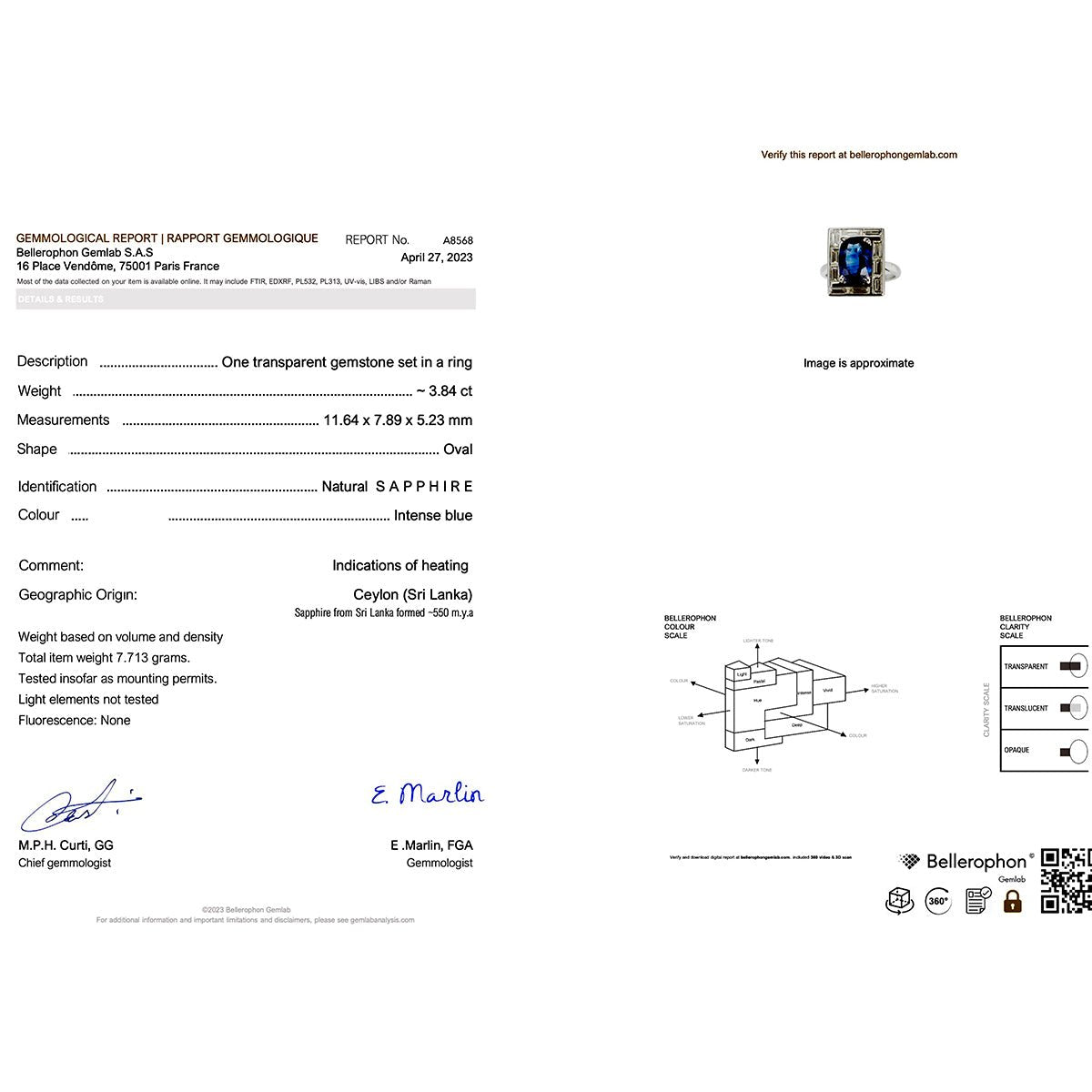 Une bague de forme rectangulaire en or blanc 750/000 sertie d’un saphir ovale d’environ 3,84 carats entourée de 10 diamants taille baguette. Certificat du laboratoire Bellerophon : Ceylan chauffé. Longueur : 13 mm Largeur : 16 mm Poids : 7,7 grammes Poids du diamant : 1,50 carat environ Tour de doigt : 53